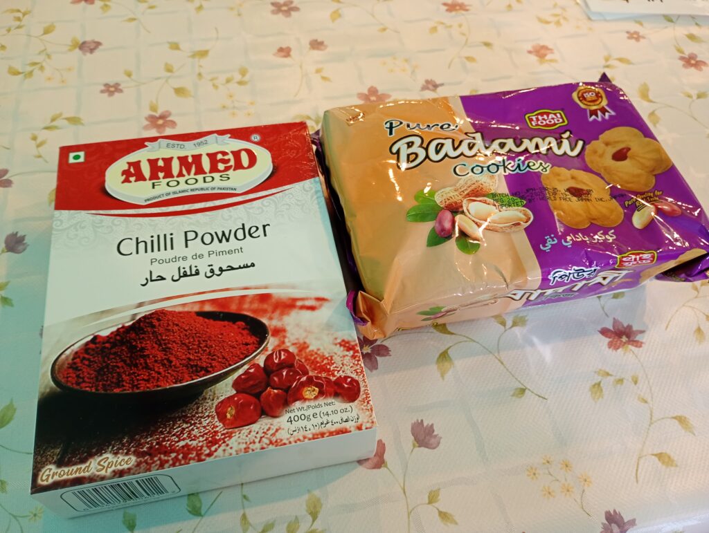 レストランには食料品コーナーが併設されており、ハラール処理した食品やお米、香辛料、お菓子などが販売されていました。チリパウダーとお菓子を購入してみました。