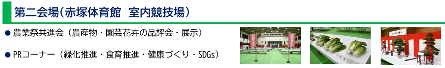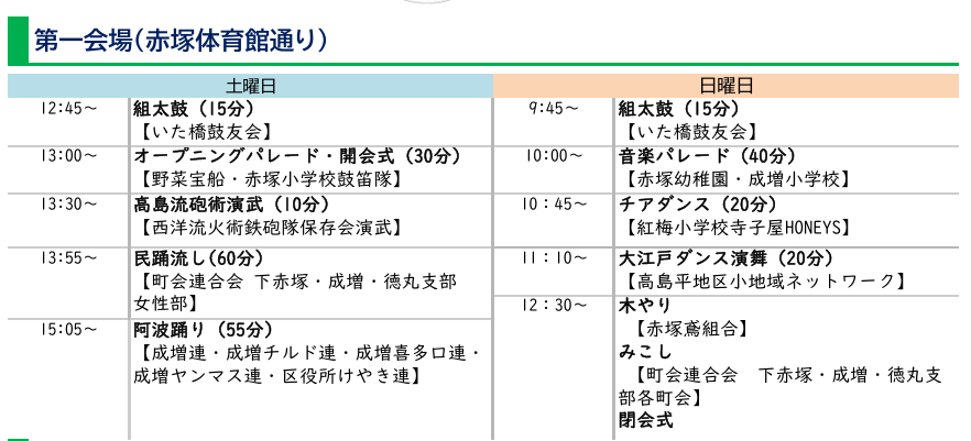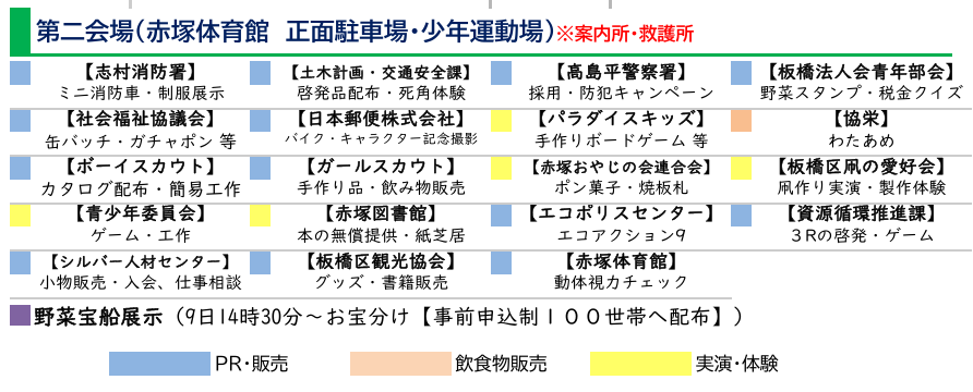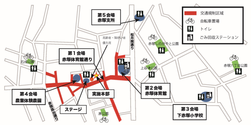 | 会場 | 赤塚体育館通り周辺 第1会場 赤塚体育館通り 第2会場 赤塚体育館(正面駐車場・少年運動場・室内競技場) 第3会場 下赤塚小学校(赤塚6-14-1) 第4会場 農業体験農園(赤塚5-22) 第5会場 赤塚庁舎(赤塚6-38-1) |