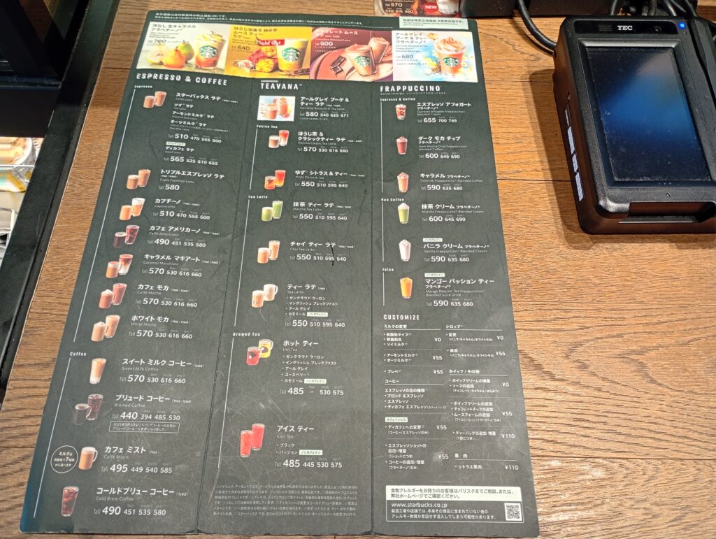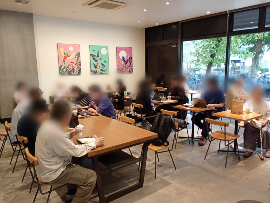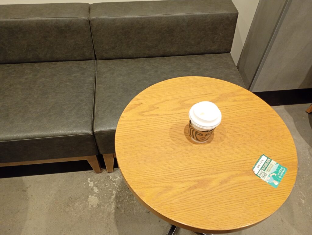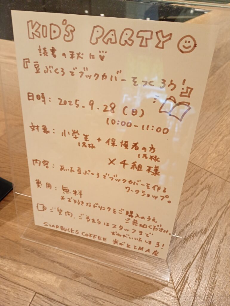 スターバックスは各店舗が独自に様々なイベントを企画・開催しているケースが多く、カウンターに「豆ぶくろでブックカバーを作ろう」というワークショップの案内がありました。コーヒー豆の袋という身近なものをリサイクルする環境への配慮と、本や読書という地域の文化を結びつける素敵なイベントですね。
