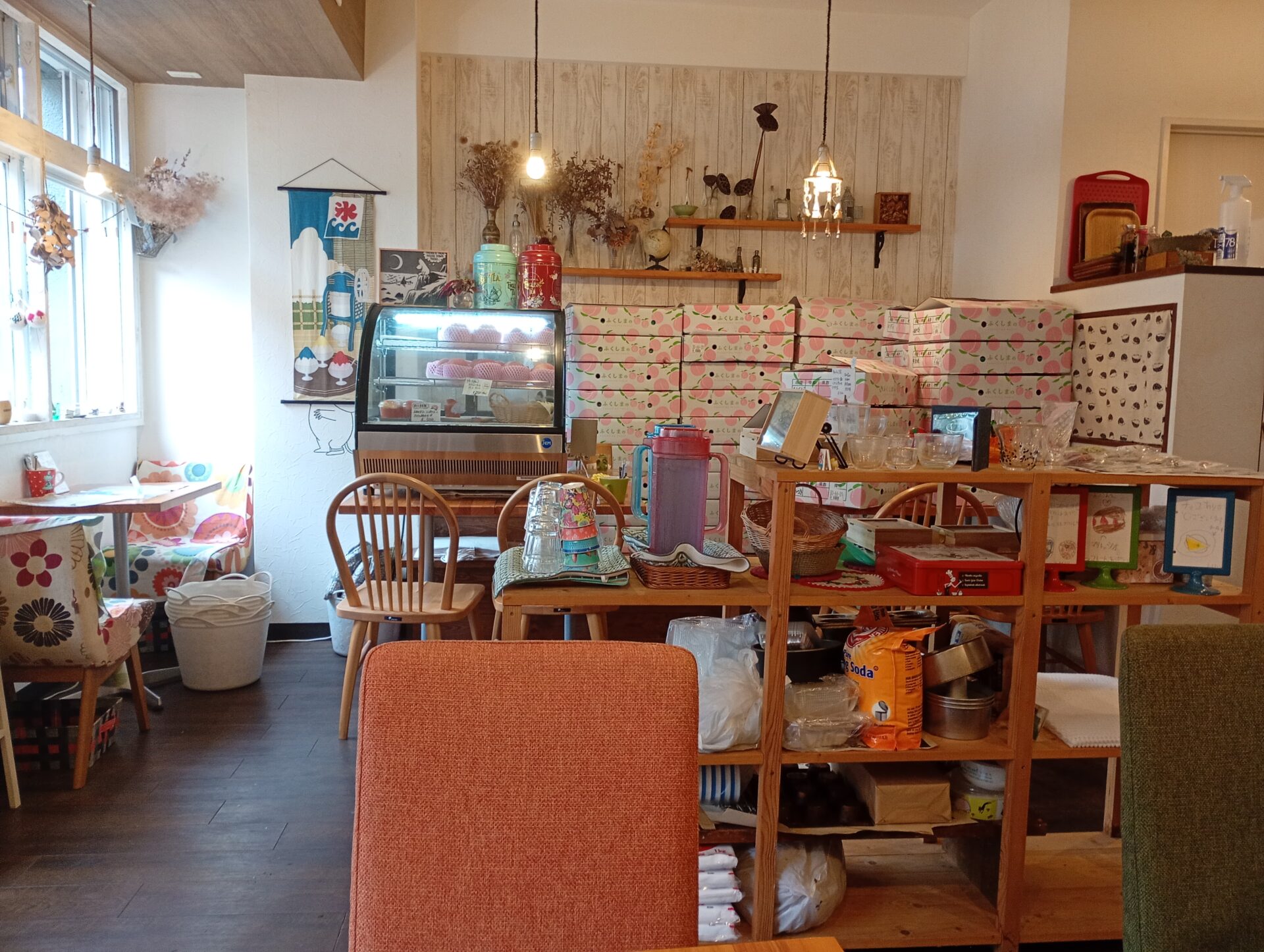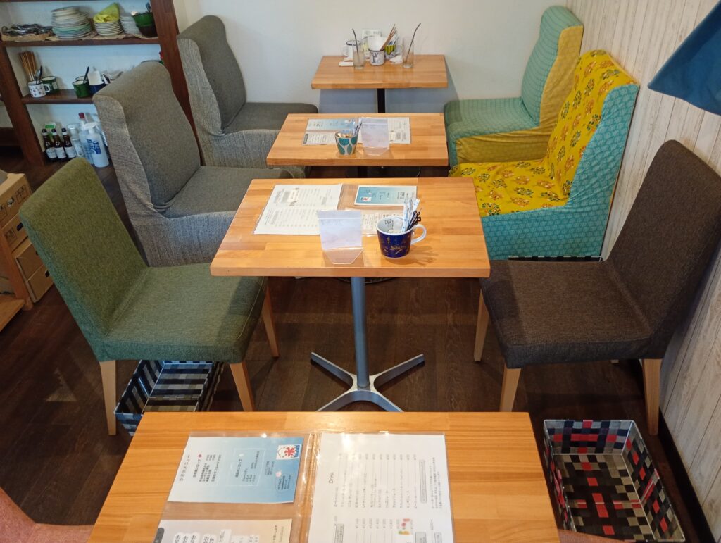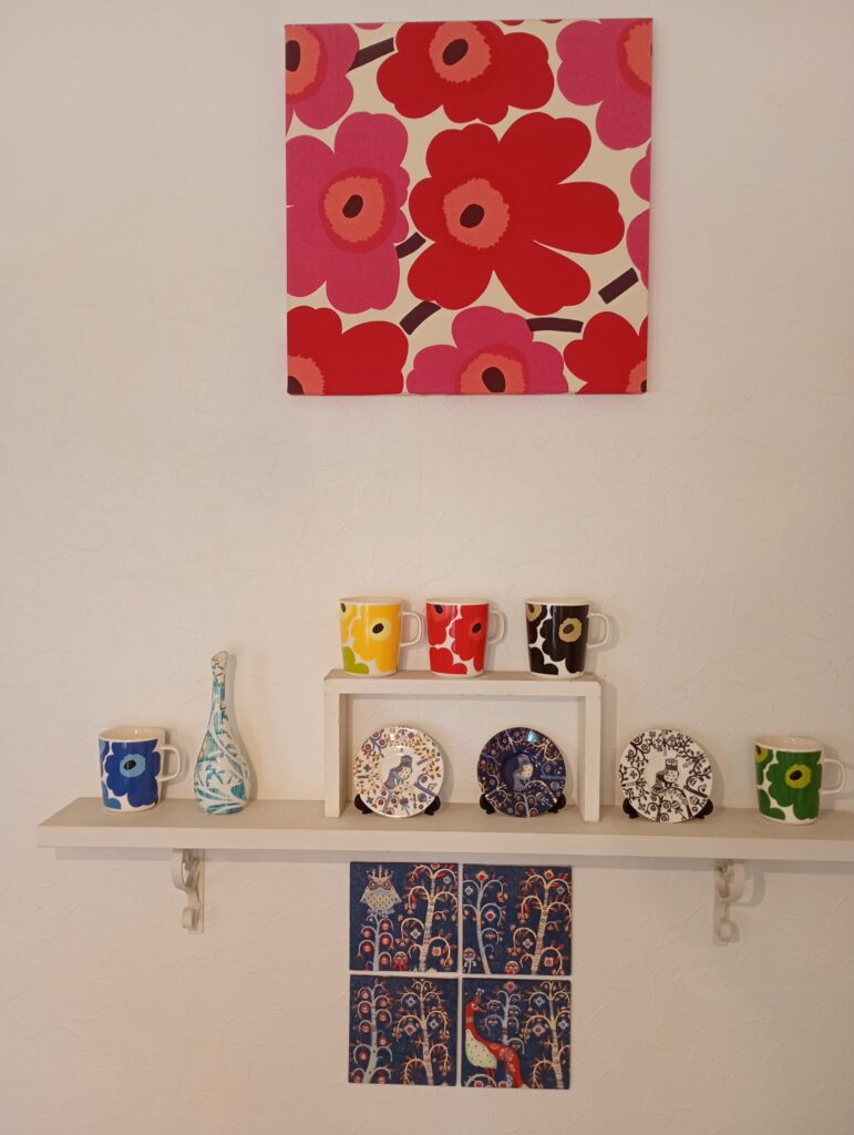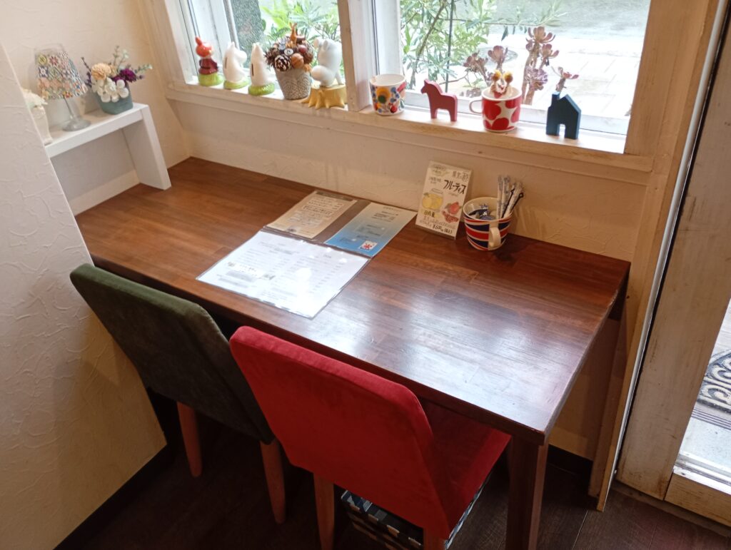 店内は北欧風のインテリアで統一されており、ムーミンの食器も使われています。センスの良い小物やお花柄のファブリックが店内を彩っています。