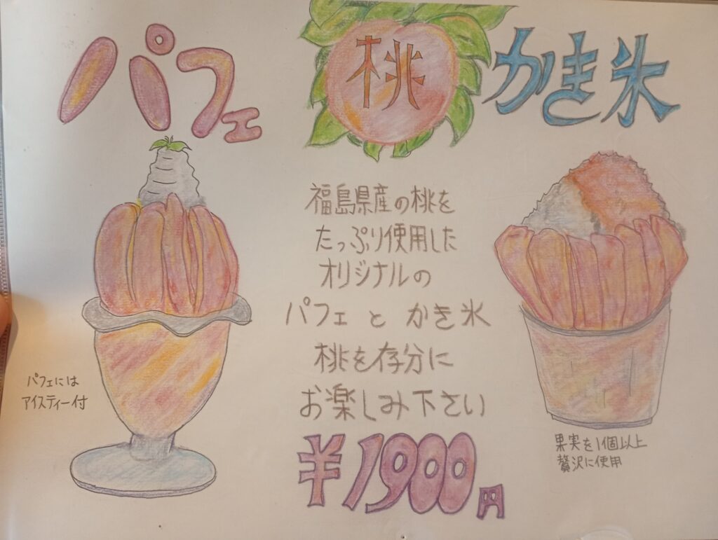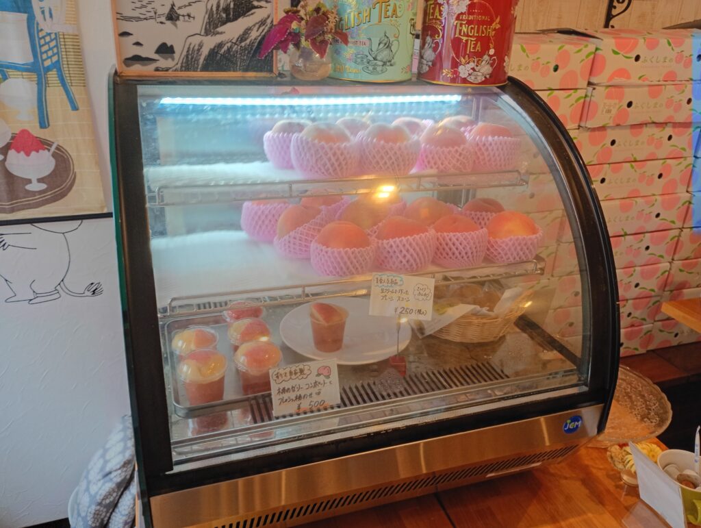 夏の時期に提供される、新鮮で甘いつやつやの桃をたっぷりと使ったパフェは、このカフェの名物として知られています。