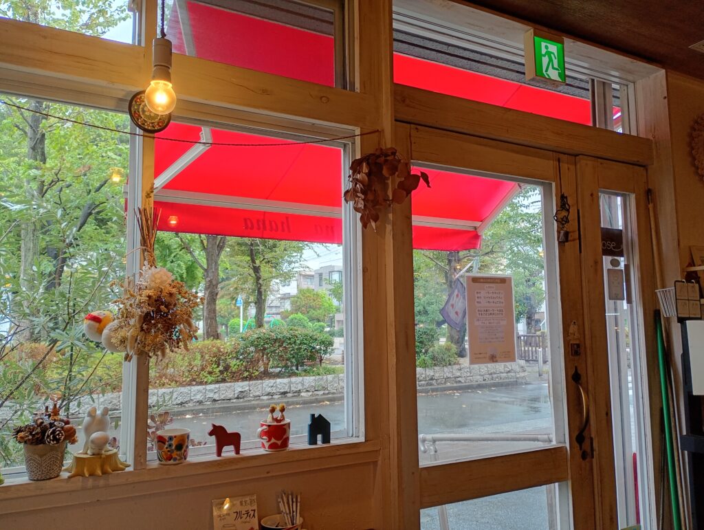 白い壁と赤いテントが目印です。となりには最近オープンしたカレー屋「エンドルフィン」さんがあります。
