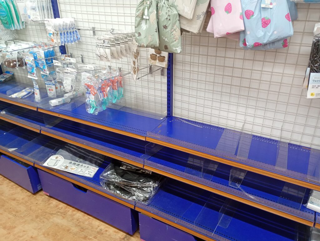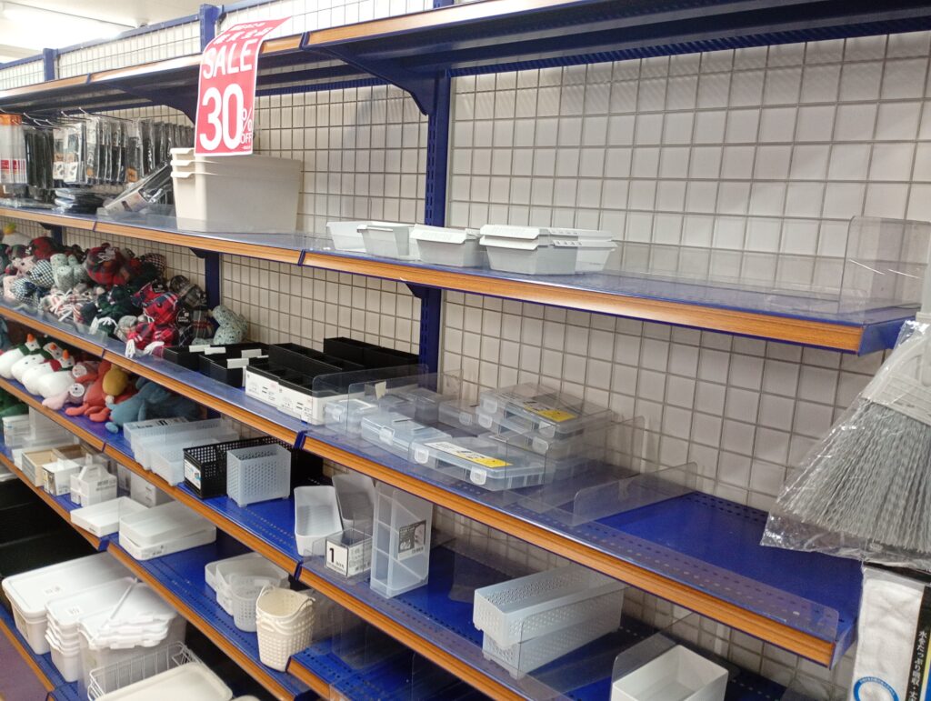 閉店セールに伴い店内商品は食品を除き30%オフとなっているため、飛ぶように商品が売れていました。一部の商品棚はすでに在庫が品薄に。