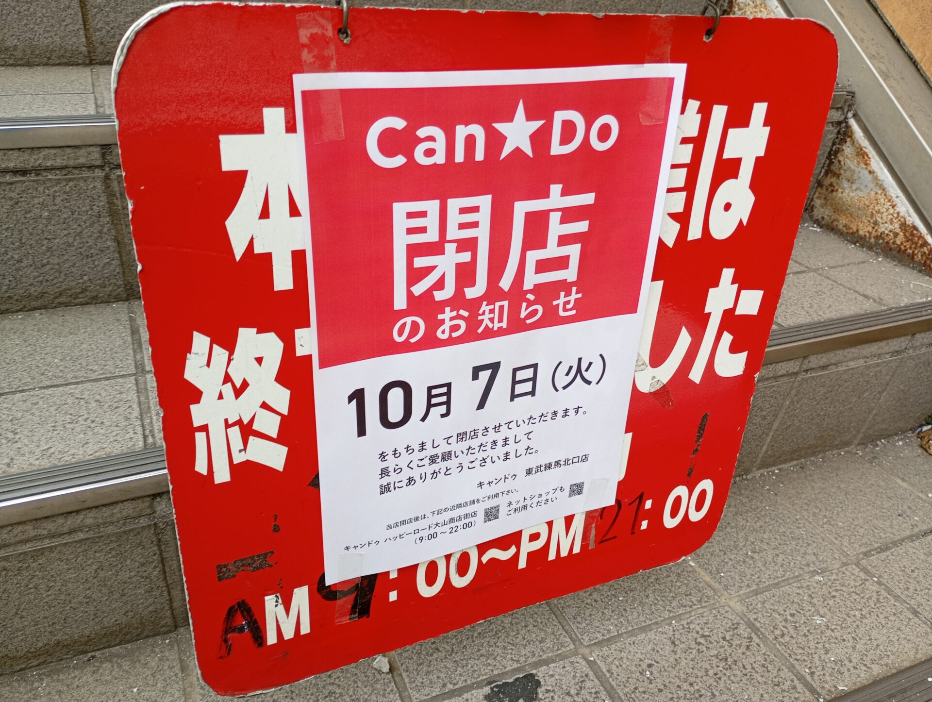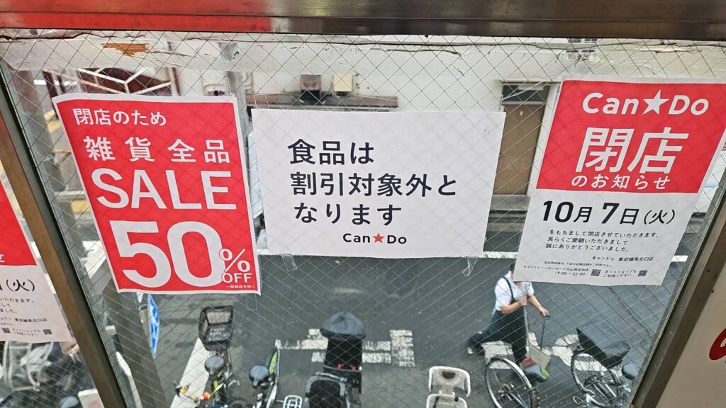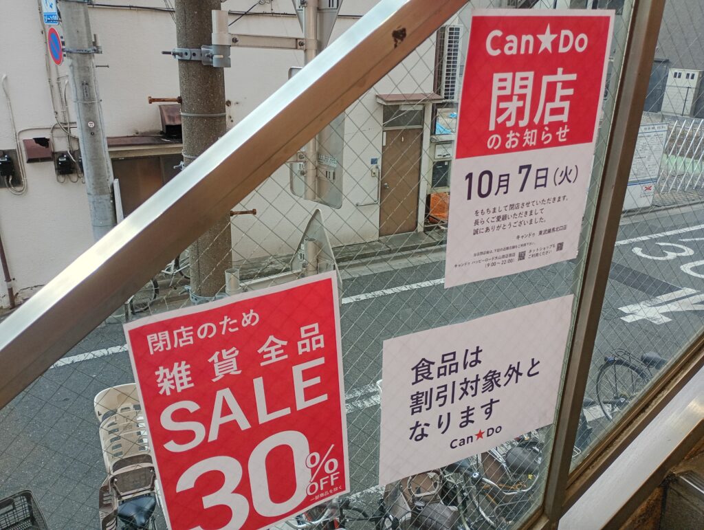 2025年10月7日CanDo東武練馬北口店が閉店となり、閉店に向け30%オフの在庫一掃セールを開催しています。閉店の背景にはイオン板橋店のCanDoのグランドオープンがあるようです。
