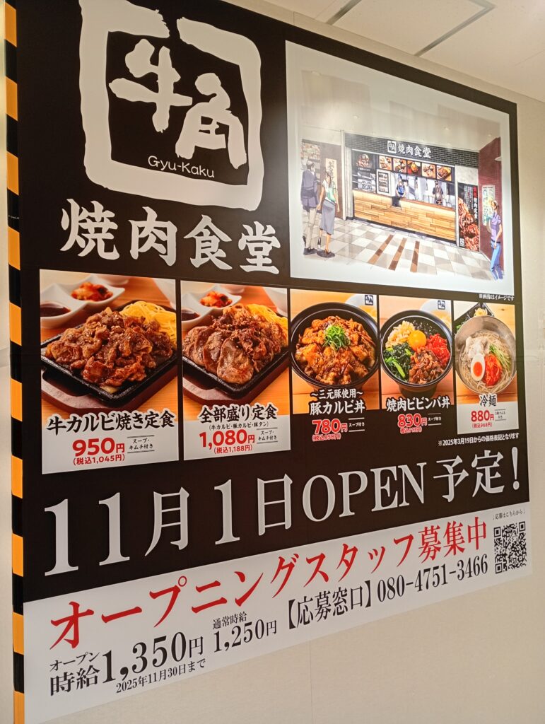 3階のケヤキDININGには、牛角食堂がオープンとなります。11月中旬には焼肉きんぐが映画館フロアにオープンするので、牛角ときんぐという焼肉大手が揃ってオープンすることになりそうです。