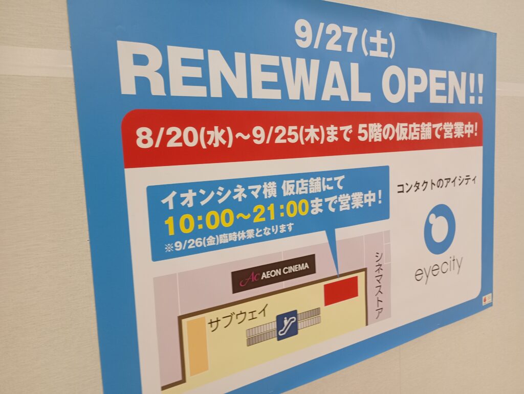Patty’sやジュエリーショップベリテもオープン予定です。コンタクトのアイシティは臨時でイオンシネマの廊下で営業をしていますが、4階に戻ってきます。