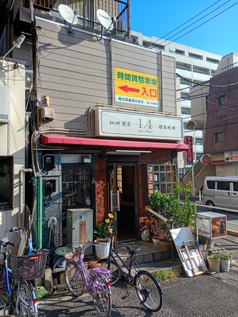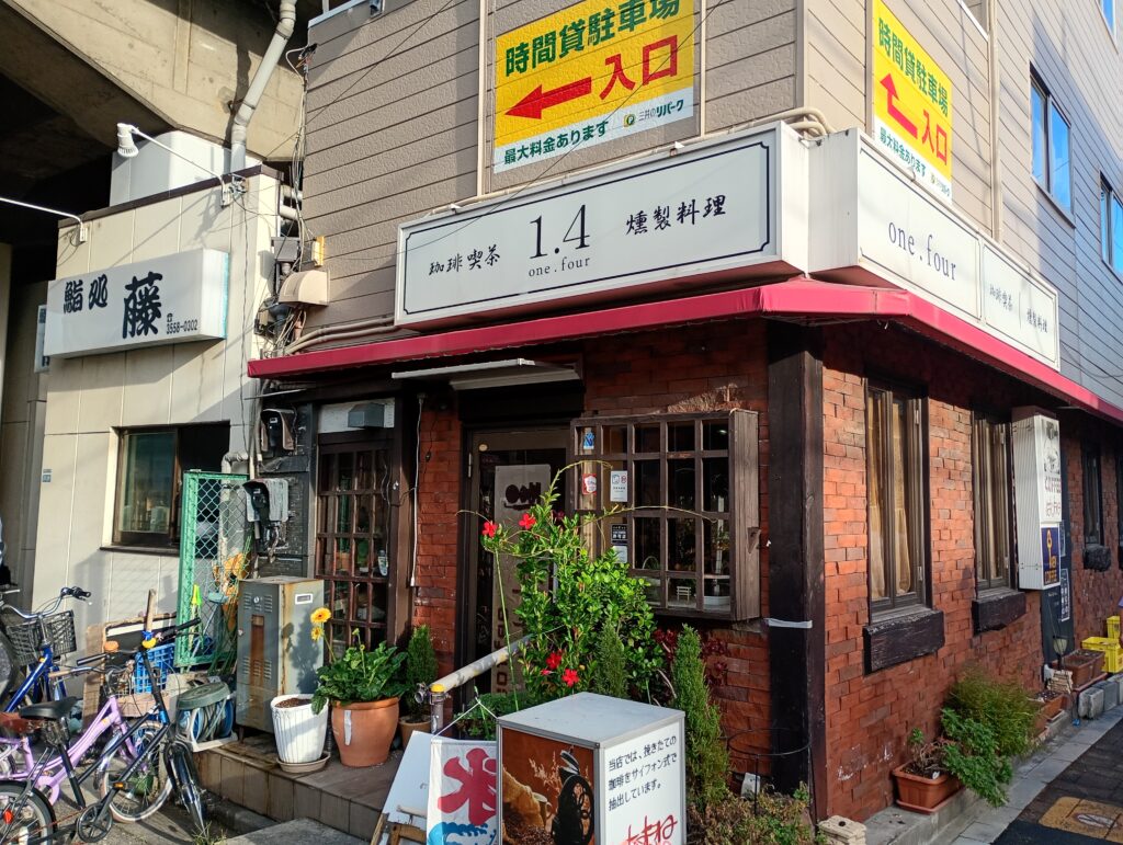 場所は蓮根駅を出て高島通り方面に30秒ほど進んだ線路の高架下にあります。看板には「珈琲喫茶1.4」と記載されており、「喫茶はすね」とは違うのかと一瞬戸惑ってしまいましたが、日中は「喫茶はすね」で、夜は燻製料理を提供するバー「1.4」になるそうです。