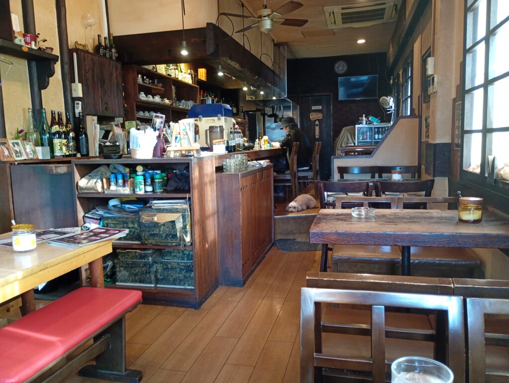 店内はレトロな雰囲気です。朝の時間帯は常連さんが多くいらっしゃるようです。看板犬が出迎えてくれます(レオくんと言うそうです)。