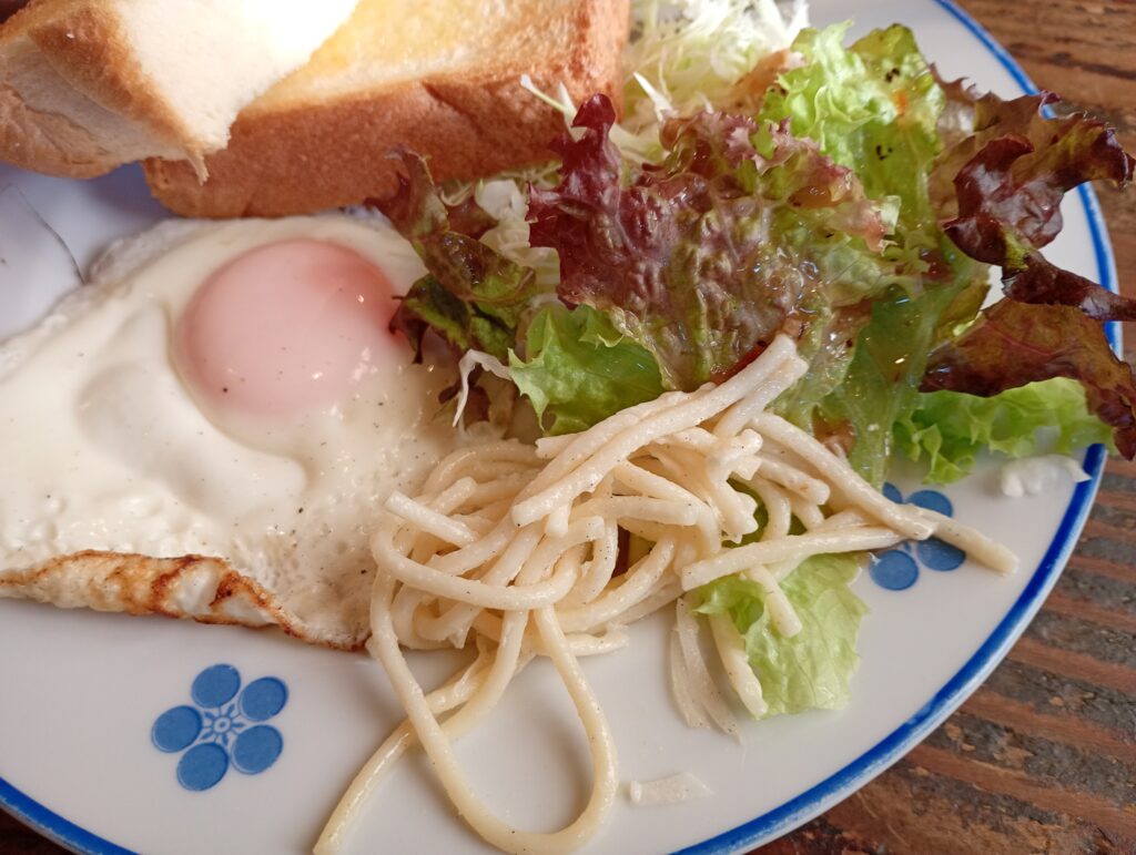 お料理は半熟の目玉焼き、ドレッシングのかかったサラダ、パスタ、バターが塗ってあるトーストです。