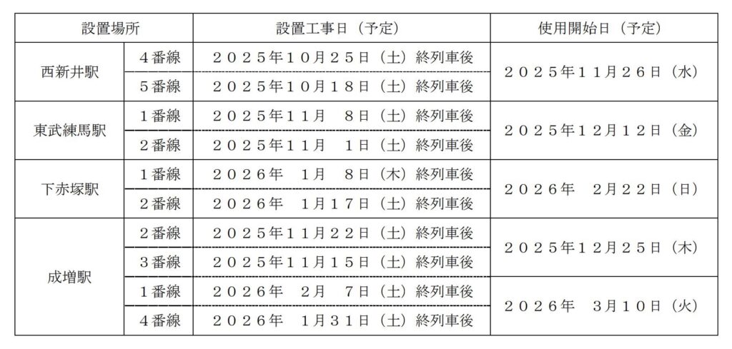 東武東上線のホームゲートの設置工事日と使用開始日が発表されました。東武練馬駅は2025年12月12日㈮、下赤塚駅は2026年2月22日㈰、成増駅は二段階に別れ、2,3番線は2025年12月25日㈭、1,4番線は2026年3月10日㈫に使用開始日が設定されています。