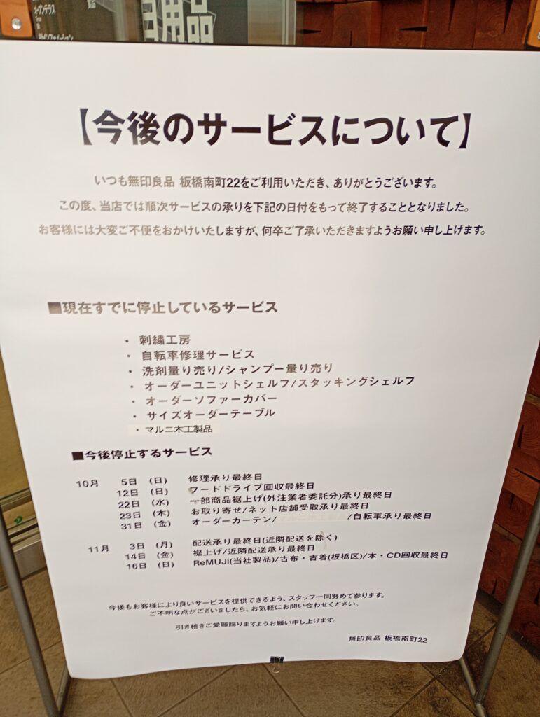 閉店のお知らせは2025年9月末に無印良品のInstagramにて発表されました。ただ、その前の2025年7月31日に「洗剤量り売り」や「刺繍工房」などのサービスが終了することが公式サイトで告知されており、もしかしたらという噂があったりもしました。