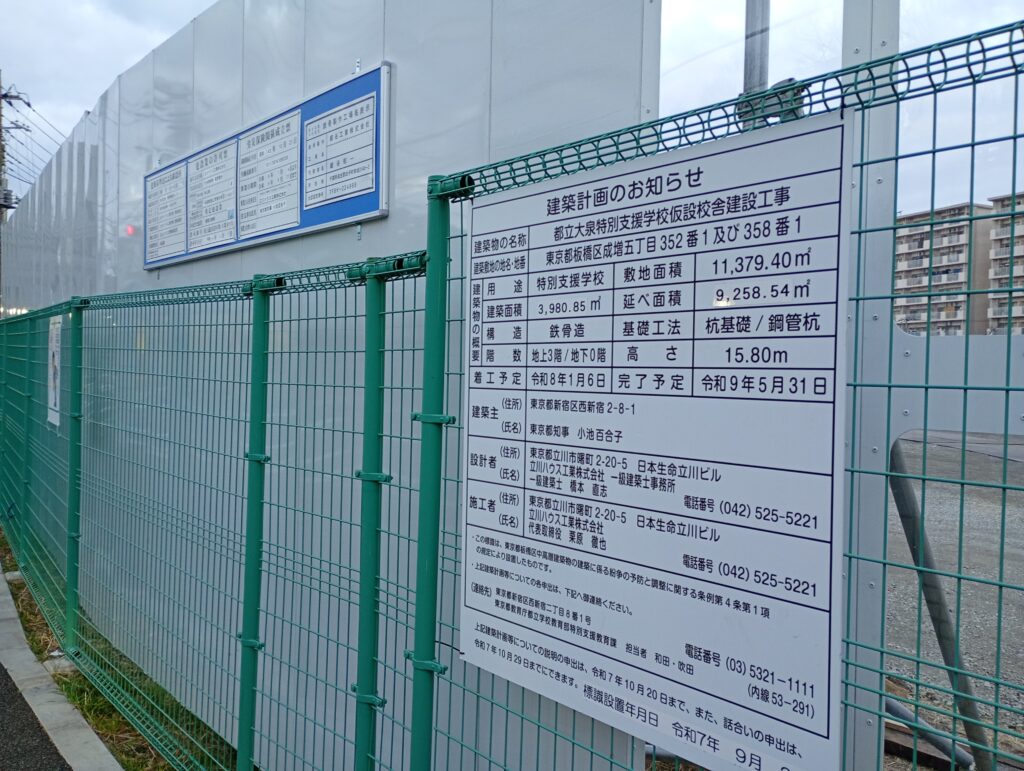 なりますチャットや成増アンケートでも、三園のUR都市機構が管理する成増団地の跡地である広大な空き地の利活用が度々話題に上がりますが、都立大泉特別支援学校の仮校舎建設工事が2026年1月から開始される旨の建設計画が掲示されました。