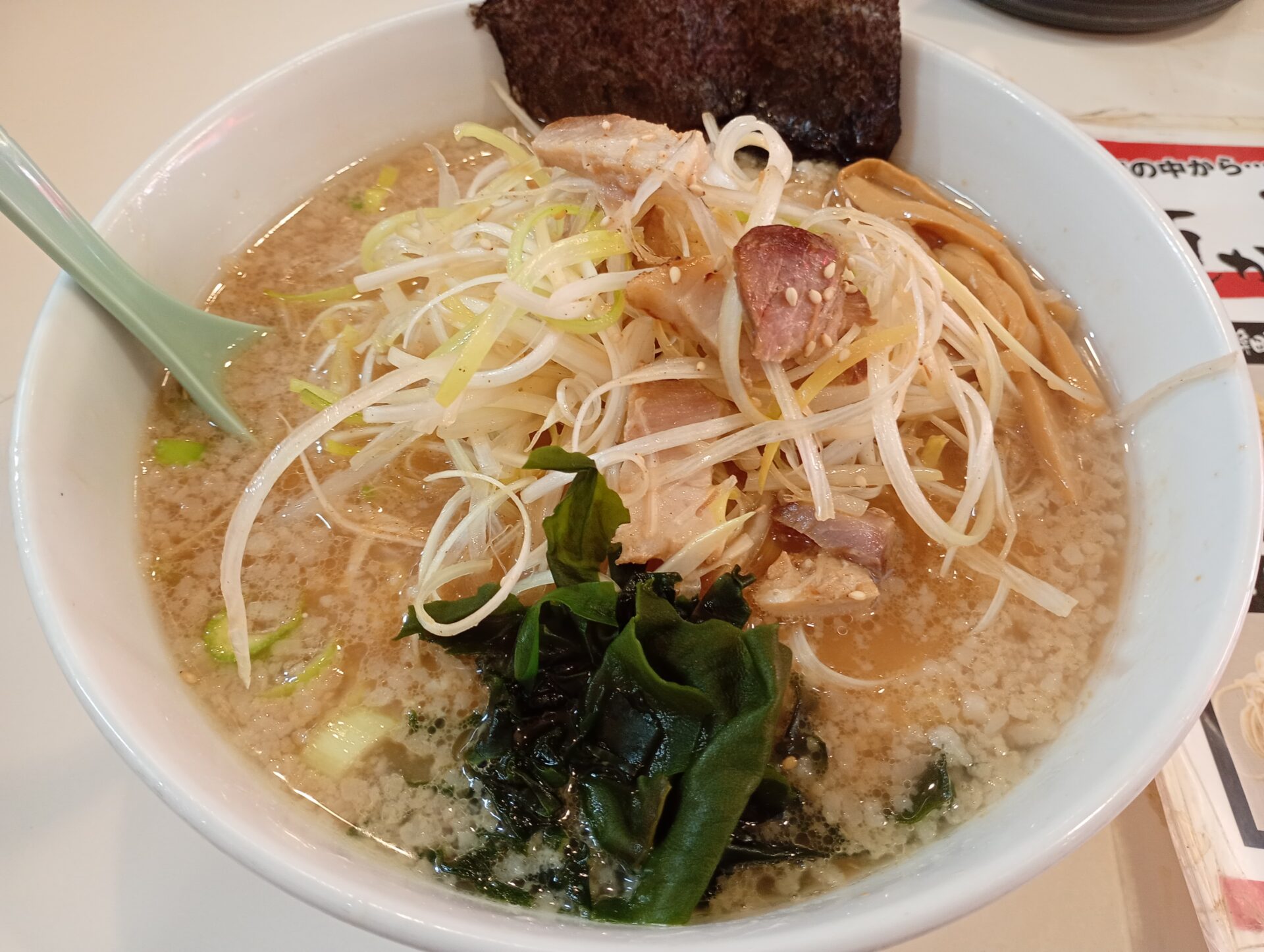 見た目はラーメンショップ特有の白髪ネギやワカメが乗り、細切れにしたチャーシューがゴロゴロとしています。ネギがシャキシャキとフレッシュで辛味が強いのでパンチがあります。