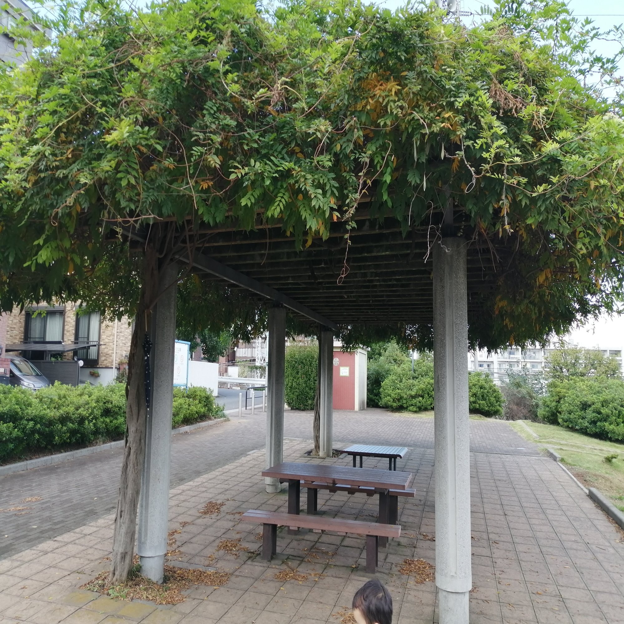 公園はとても広く、藤棚、遊具と砂場、広場と三段になっています。坂を活かしたデザインですね。