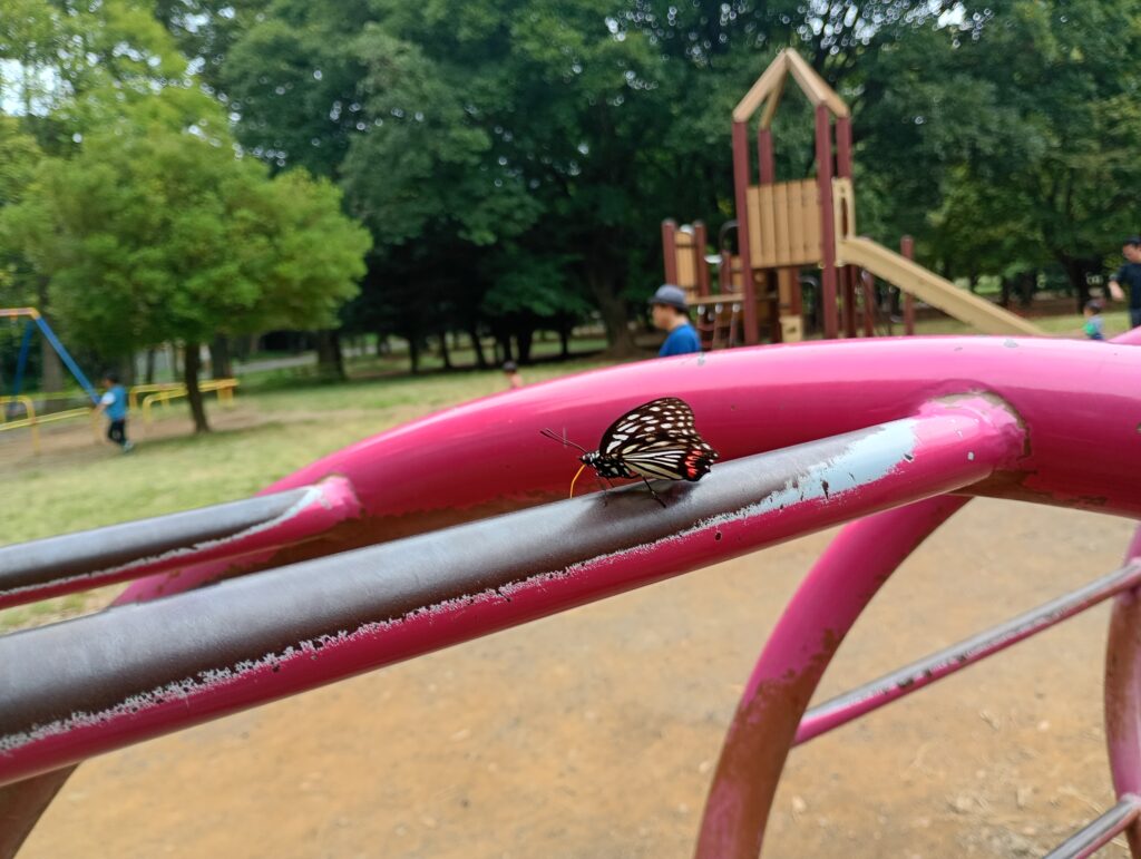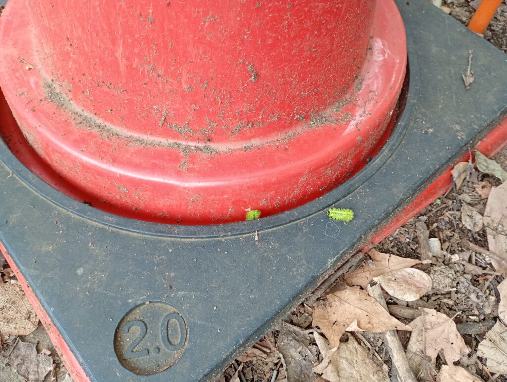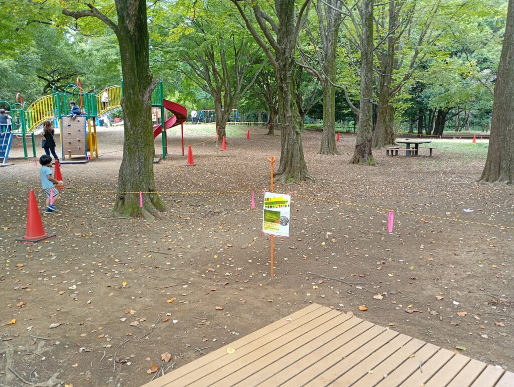 2025年10月に光が丘公園のアスレチック広場の周辺でイラガの幼虫が大量発生していました。イラガの幼虫が発生している場所は黄色いテープで立ち入り禁止になっており、足元には黄緑色の幼虫がたくさんいました。