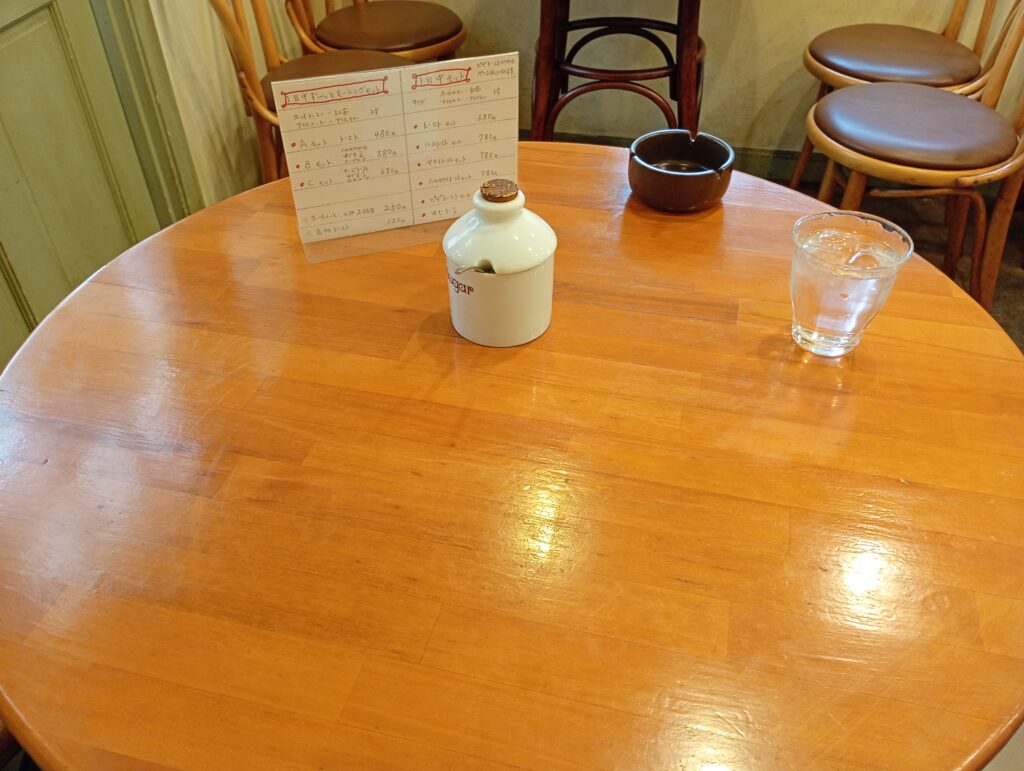 店内は奥行きが広くテーブルが9席あり、外見よりも広々としています。入口手前の丸テーブルに座らせて頂きました(全席喫煙可となっています)。