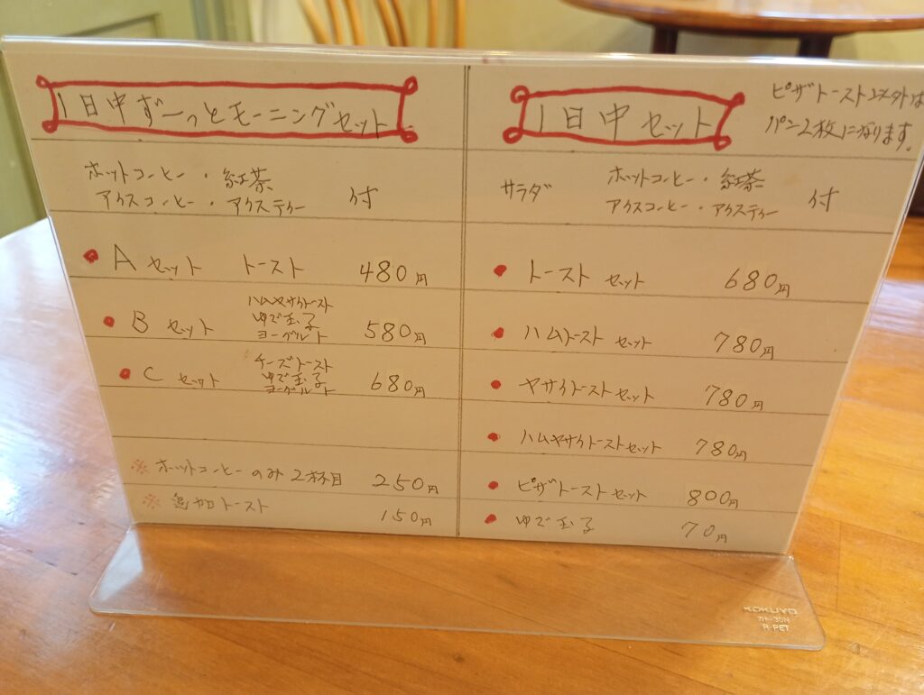 テーブルにもメニューがありました。1日中モーニングを提供しているとのことなので、モーニングCセット680円を注文してみました。