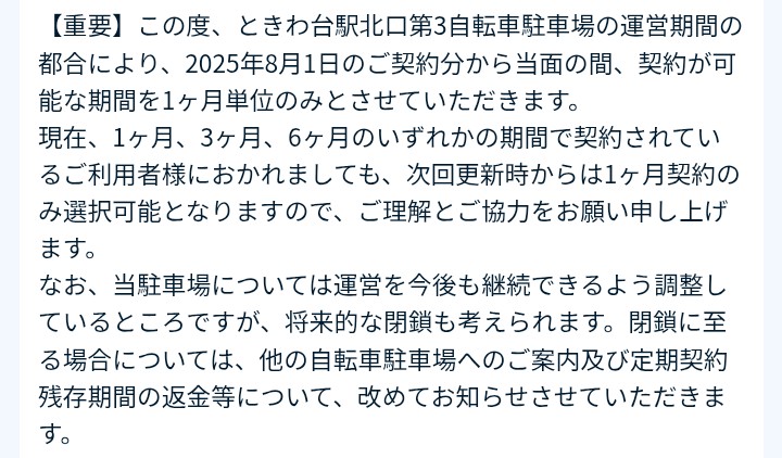 区営自転車駐車場のホームページにおいて、ときわ台第3自転車駐車場の閉鎖の可能性を示唆する投稿があります。