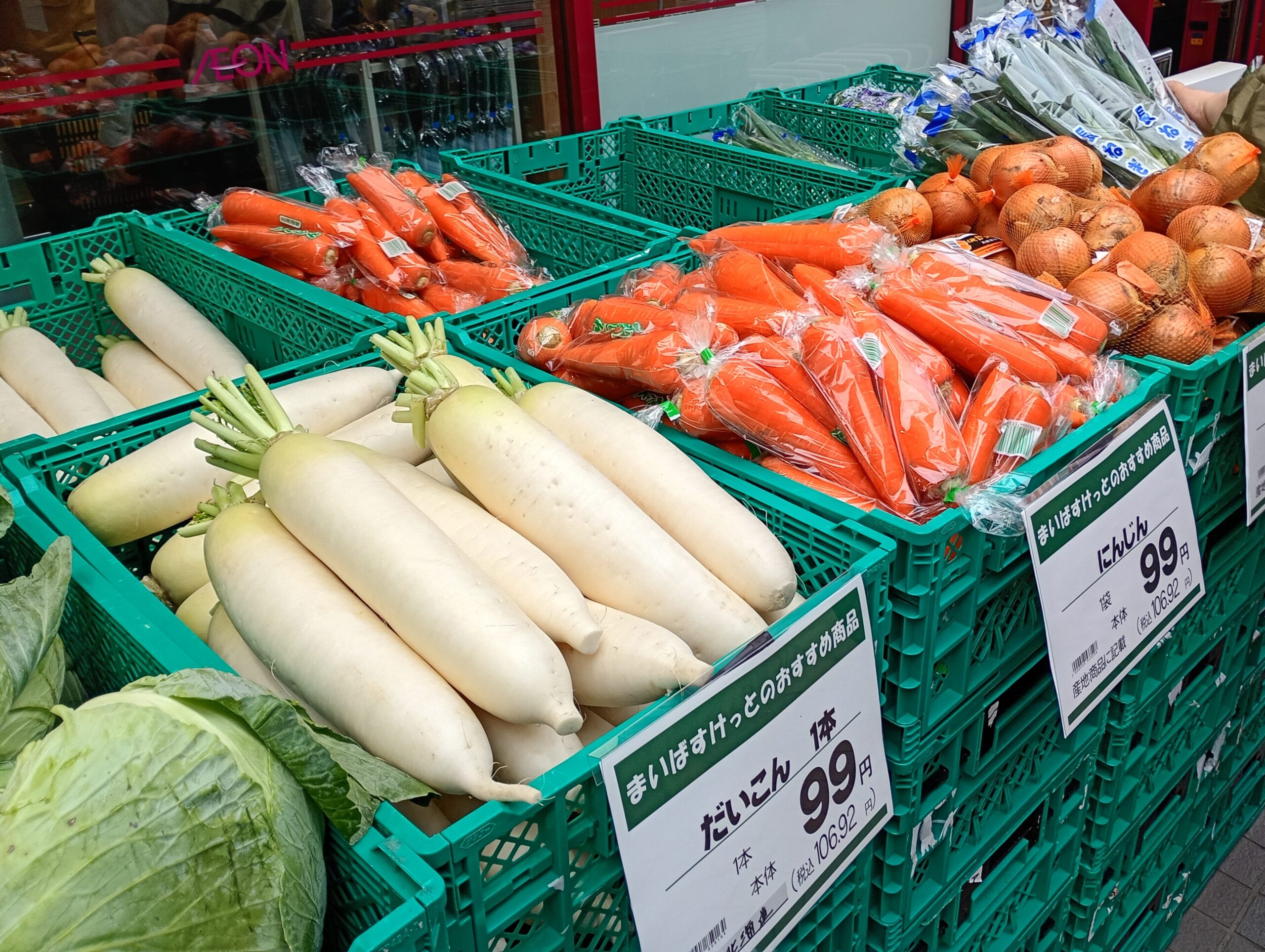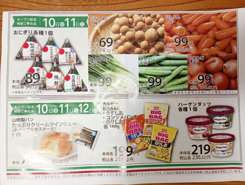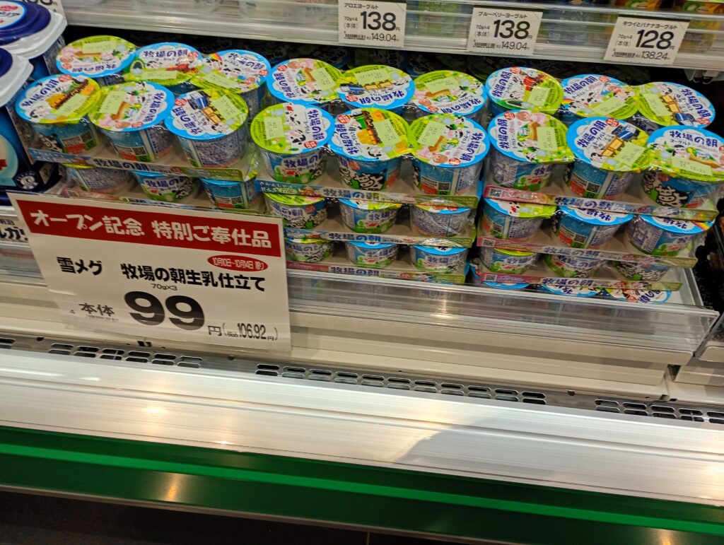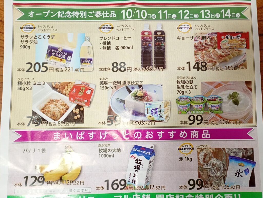 まいばすけっとのリニューアルセールの定番商品が並んでいます。