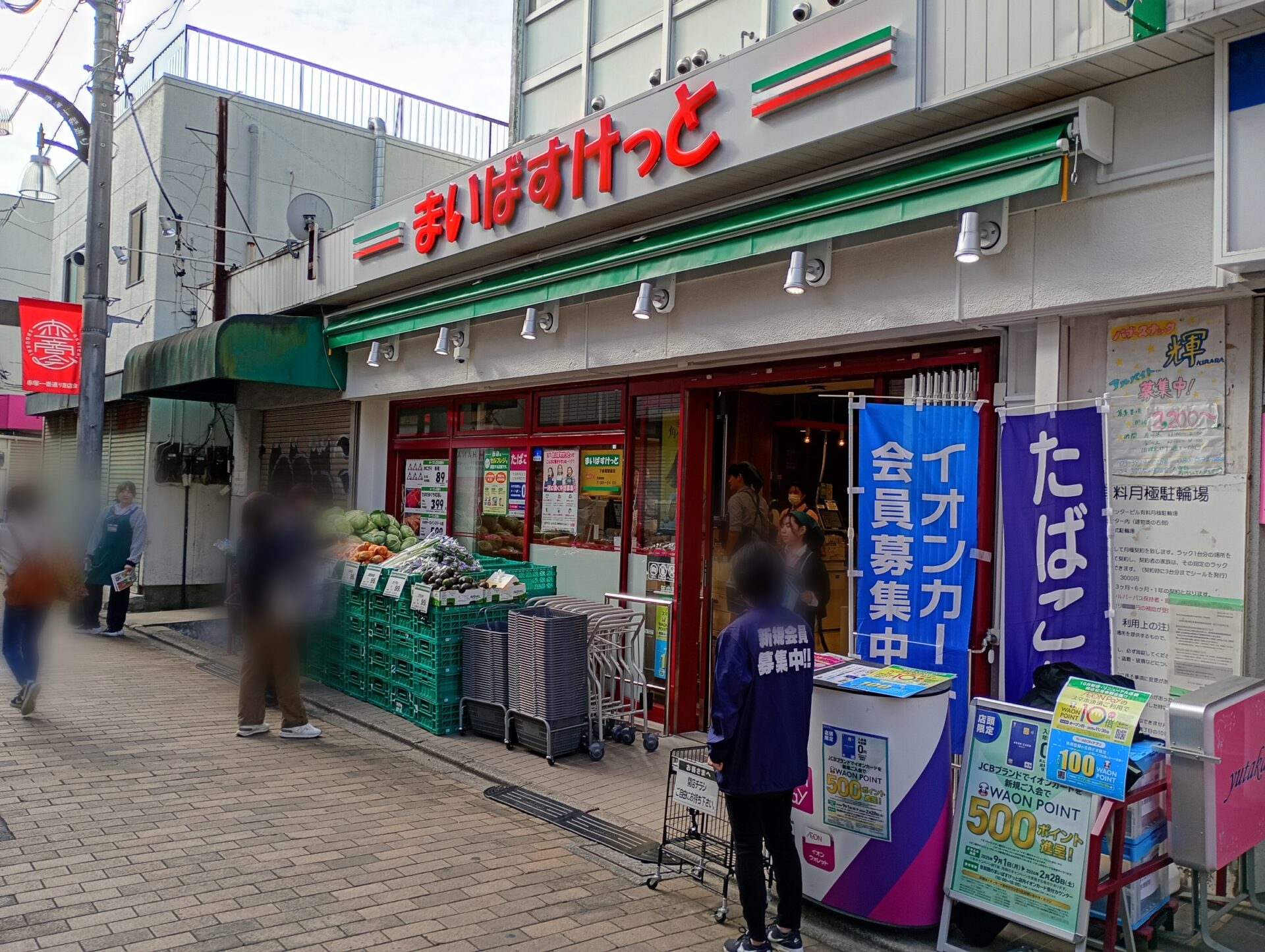外観は依然と特に変わらず、商店街の通りに「まいばすけっと」の赤い看板が出ています。