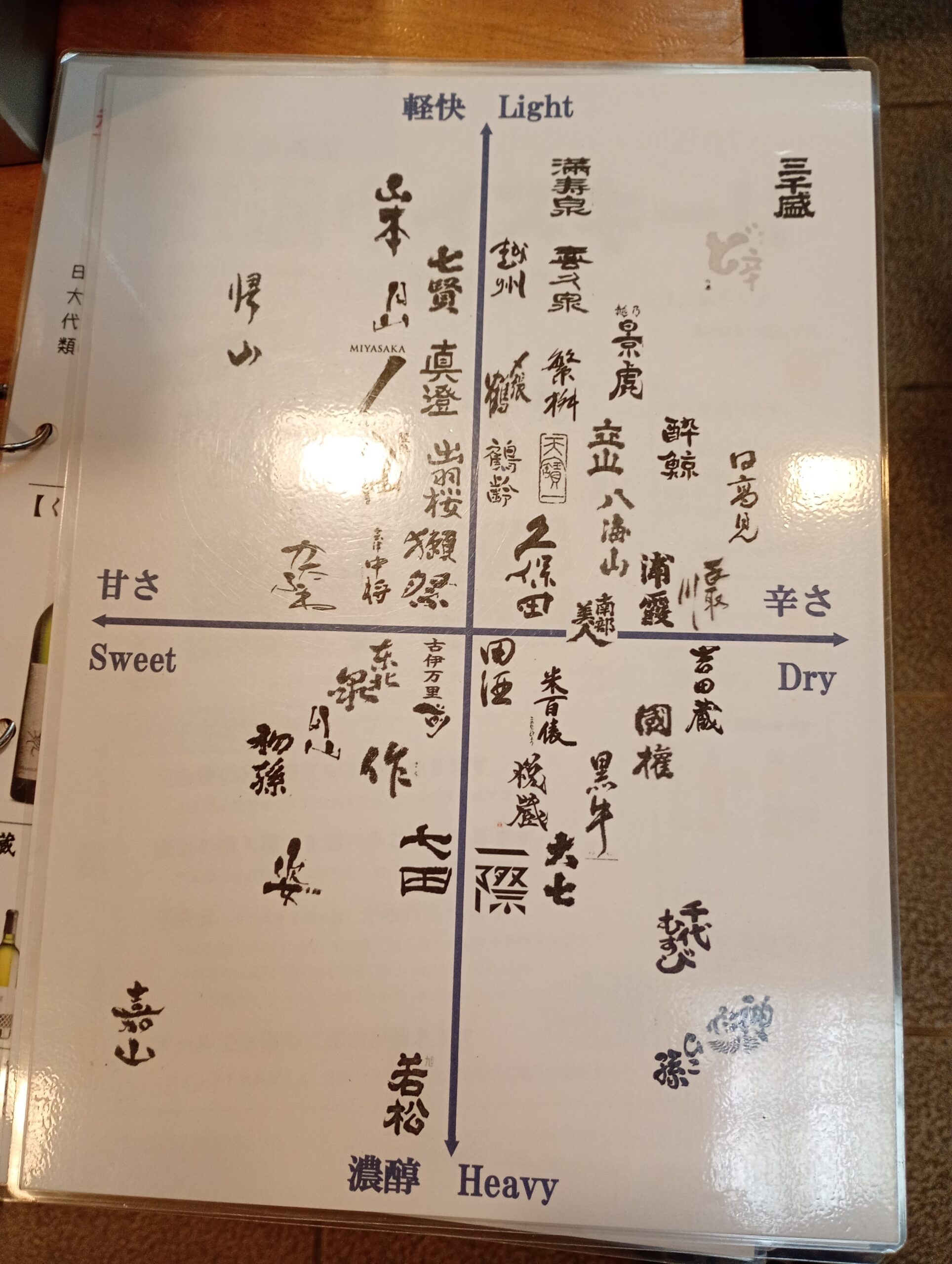 非常にたくさんの日本酒が陳列されていますので、どれを選んでいいのか迷う方も多いようで、お店の方が比較表を見せてくださいました。
