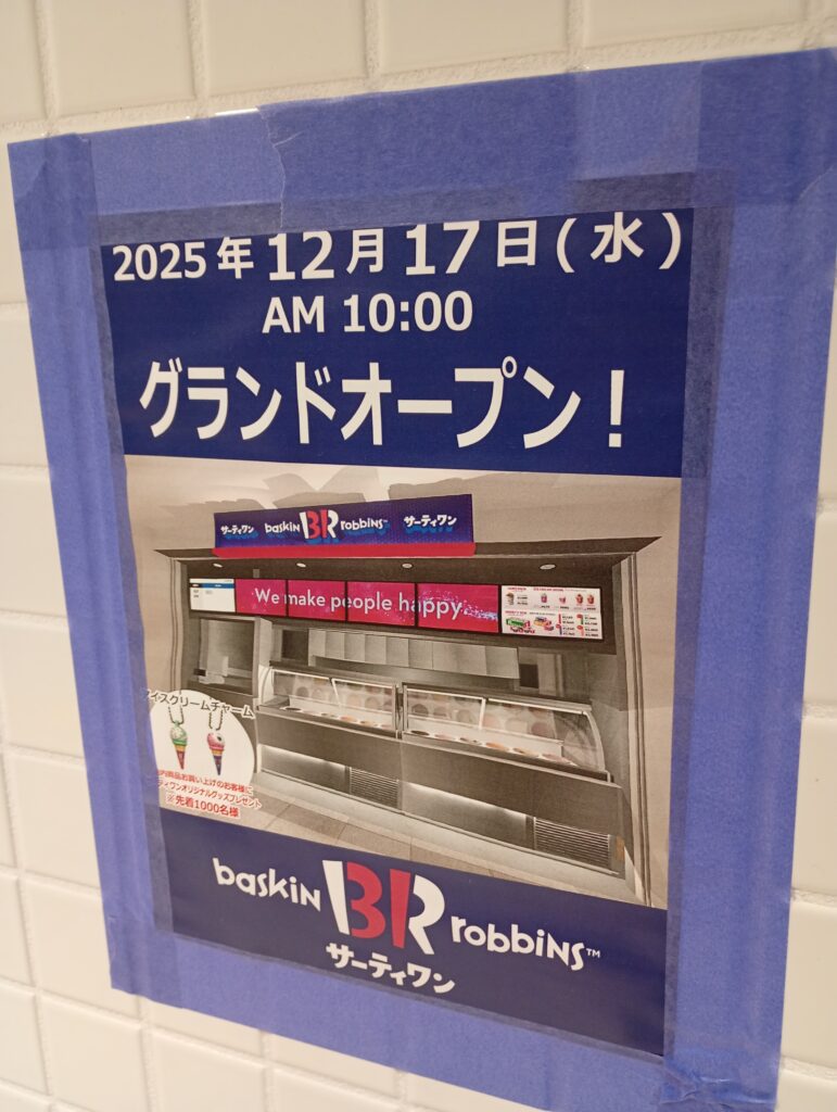 オープン時期は2025年末とのことです。ただ、サーティワンはクリスマスやお正月に需要が伸びる傾向にあるため、そうしたタイミングに間に合うようにオープンする可能性もあるかもしれませんね。