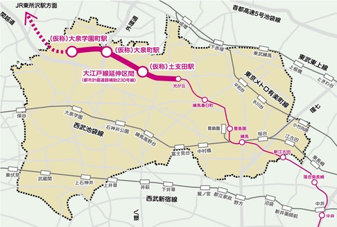 「大江戸線の延伸」は、現在光が丘駅まで整備されている都営地下鉄大江戸線が大泉町・大泉学園町を通り、JR武蔵野線東所沢駅へ延伸するネットワーク計画です。
