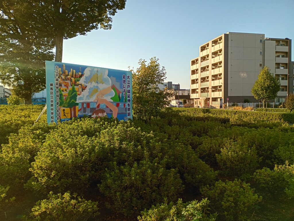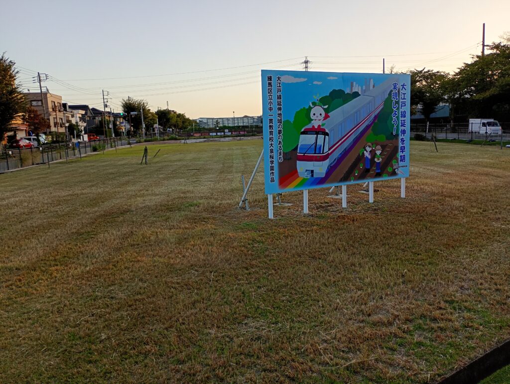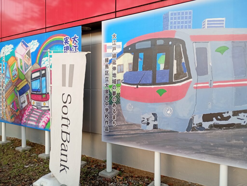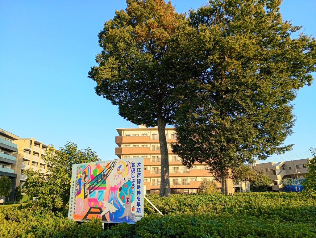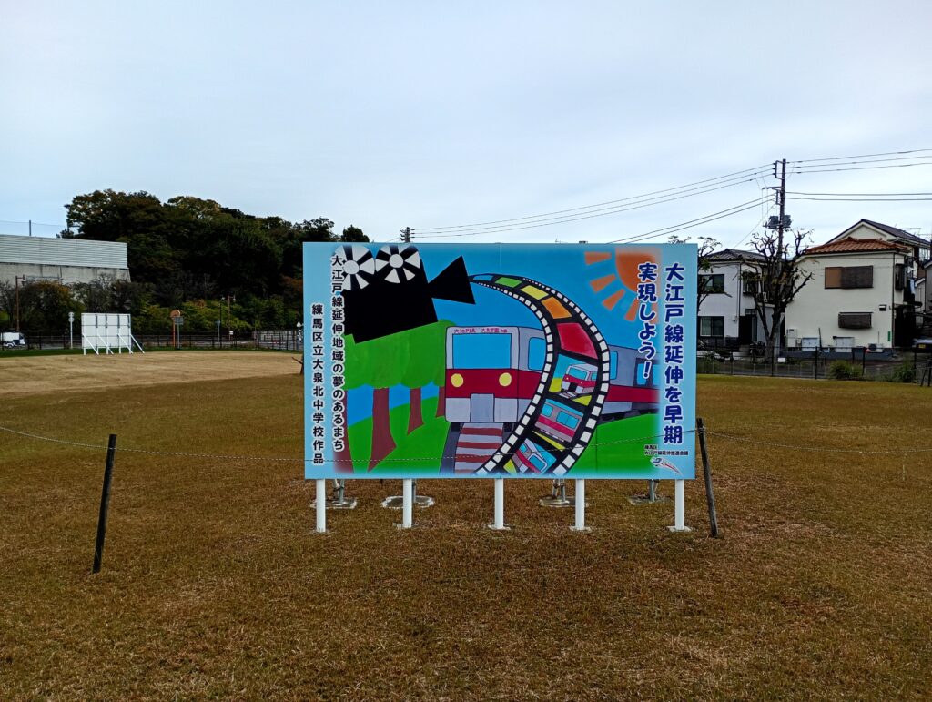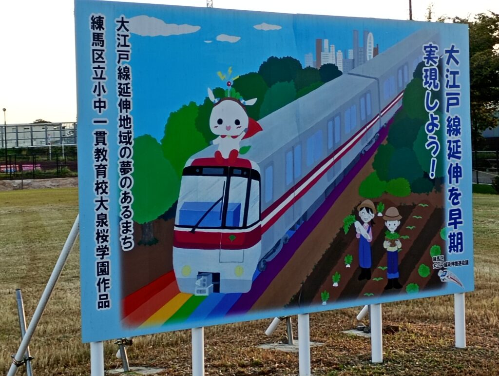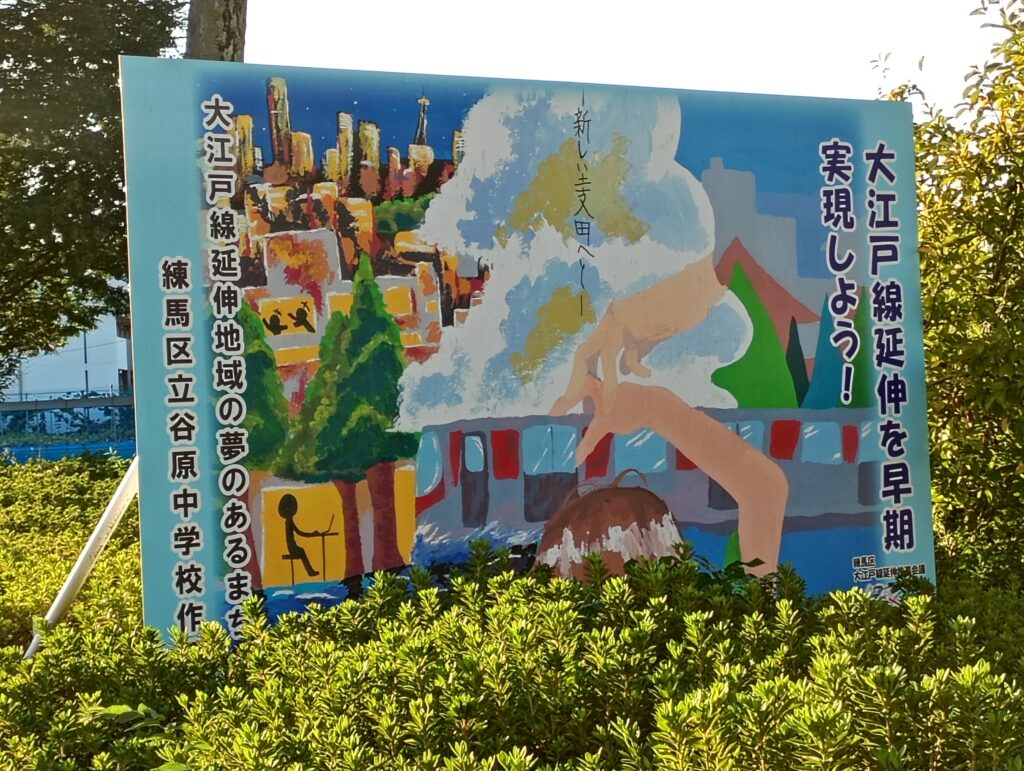 大きなけやきの木がそびえたち、練馬区立八坂中学校の児童が書いた大江戸線の延伸に関する絵が掲示されています。土支田地域を含む練馬区北西部は、これまで最寄りの駅まで1km以上離れている「鉄道空白地域」とされてきました。大江戸線の延伸に伴い、都心部への移動にかかる所要時間が大幅に短縮されます。