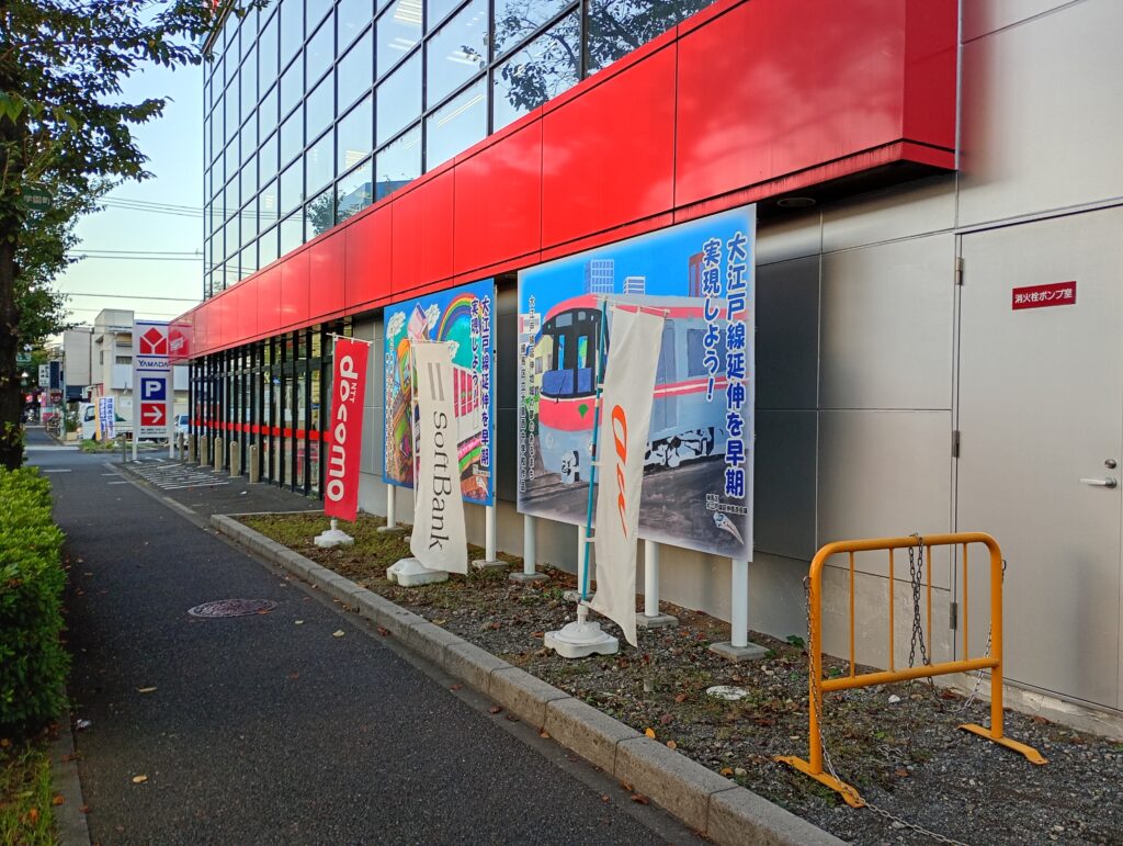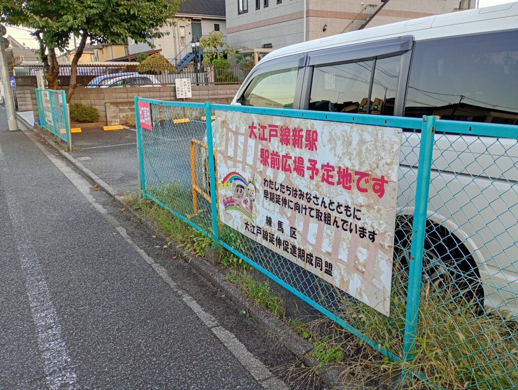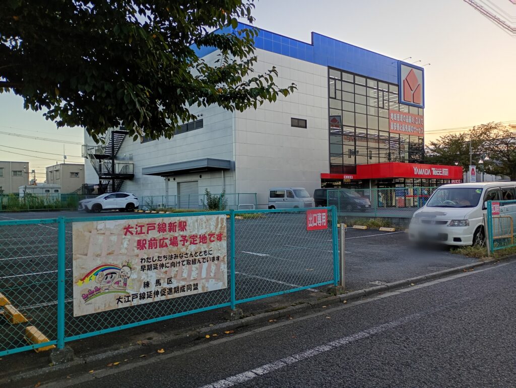 ヤマダ電機の隣の駐車場に「大江戸線新駅 駅前広場予定地」との掲示があります。周辺の用地買収が進んでおり、大泉学園町駅周辺を含む「外環道から大泉学園通り」の区間は、補助230号線が整備される予定です。
