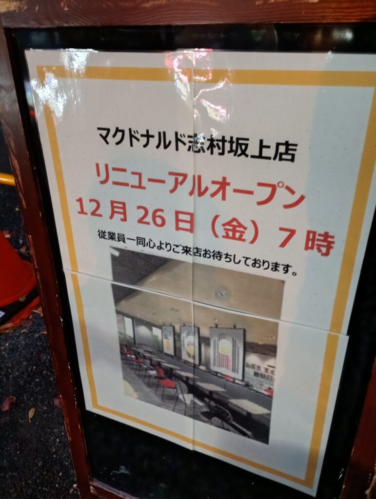 2025年9月1日から休店しリニューアルに向けた工事を行っていたマクドナルド志村坂上店ですが、オープン予定の10月17日㈮にお店に足を運んでみるとお休みのようでした。工事が難航しているようで、オープンまではしばらくかかるそうです(年内にはオープンするのではないかという噂を聞いています。12月26日になるみたいですね)。