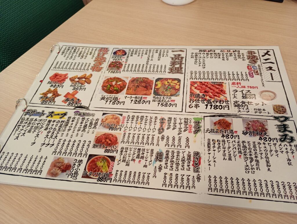 居酒屋メニューもあり、串焼きや中華料理などが並んでいます。四川の重慶という寒い地域の料理がベースにあります。