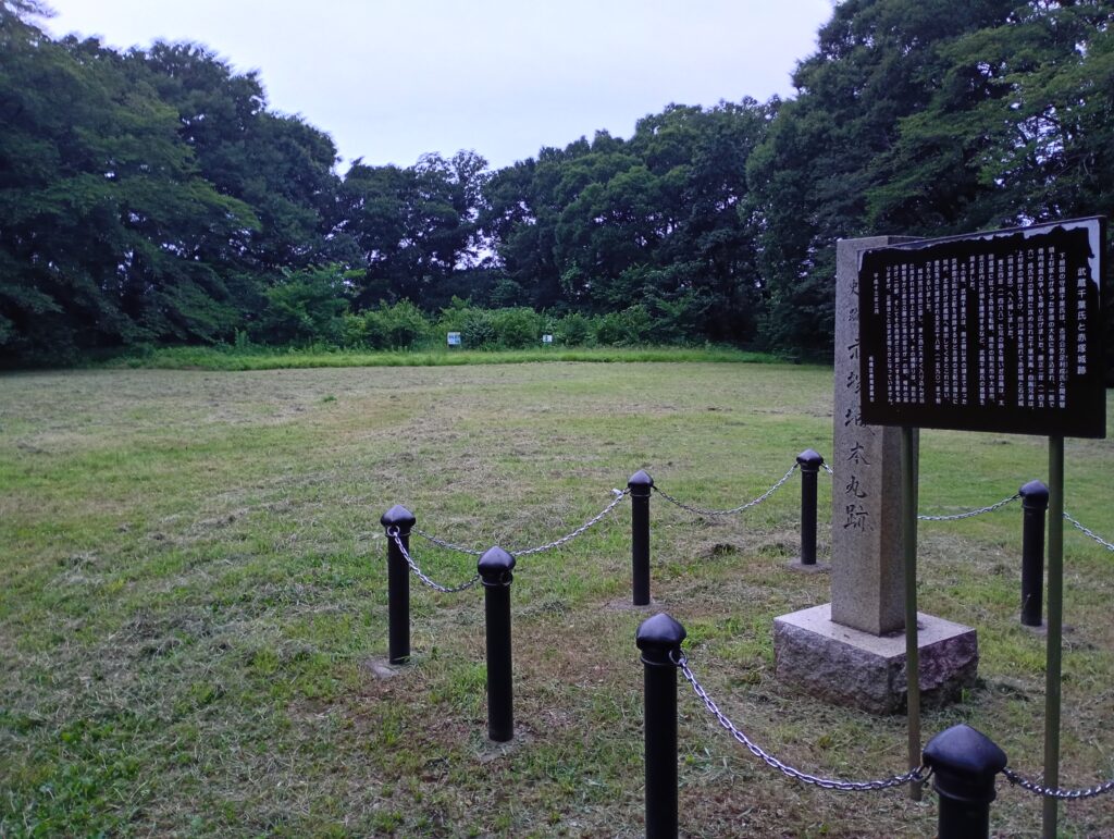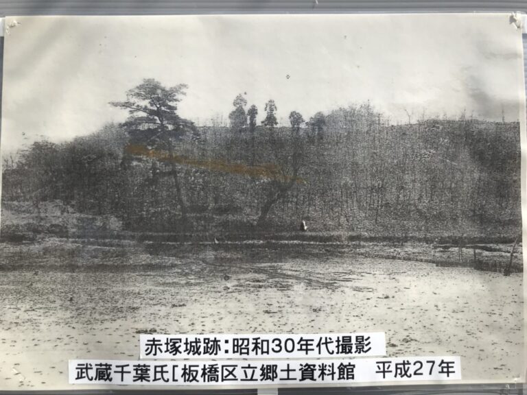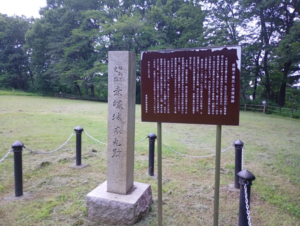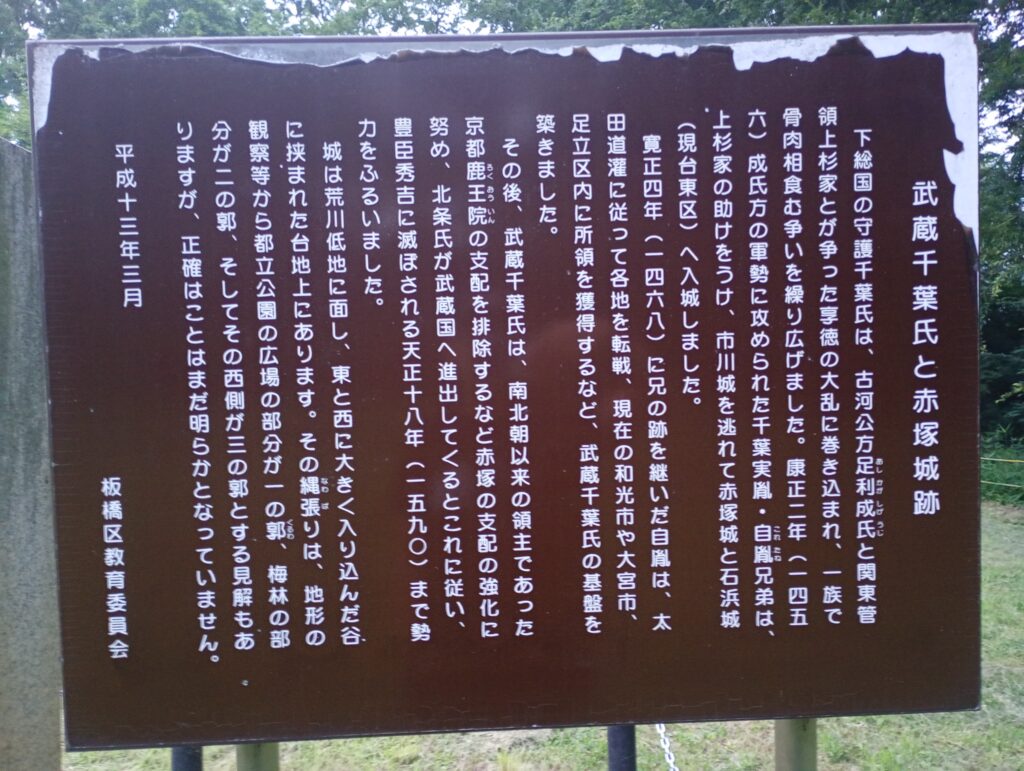雑木林の階段を登ると赤塚城址があり、「武蔵千葉氏と赤塚城址」という案内板と碑が立っています。ただ、今では城址周囲の空堀くらいしか痕跡はなく、草原が広がっていて、子どもたちが虫取りに興じています。