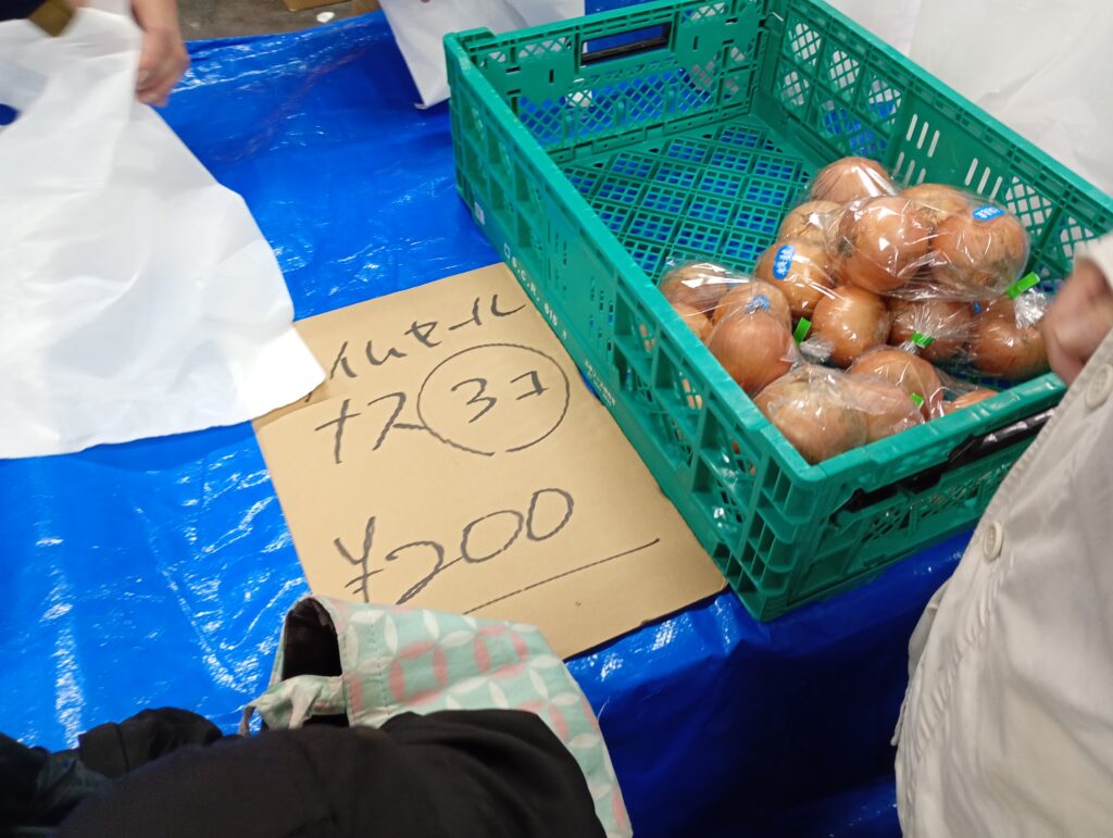 かろうじてナスや玉ねぎが残っていました。ナスは3袋で200円とめっちゃ安いです。残り物には福がある感じでした!