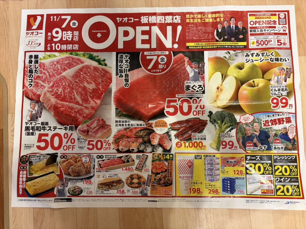 2025年11月7日㈮ヤオコー板橋四葉店がオープンし、地域の方で賑わっています。特に、夕方以降ののセールの時間帯は店内が活気づきます。