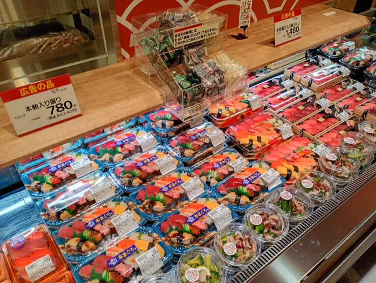 夕方になると生鮮の割引が始まります。魚は18時には安くなっている印象です。ピザ屋お弁当等の総菜系また、寿司等も10%や20%オフから始まり、閉店前には50%オフになります。夕方になると駐車場の列も長くなるとともに、駐輪場も賑わいます。店内にもセールのアナウンスが響き、活気ついてきます。