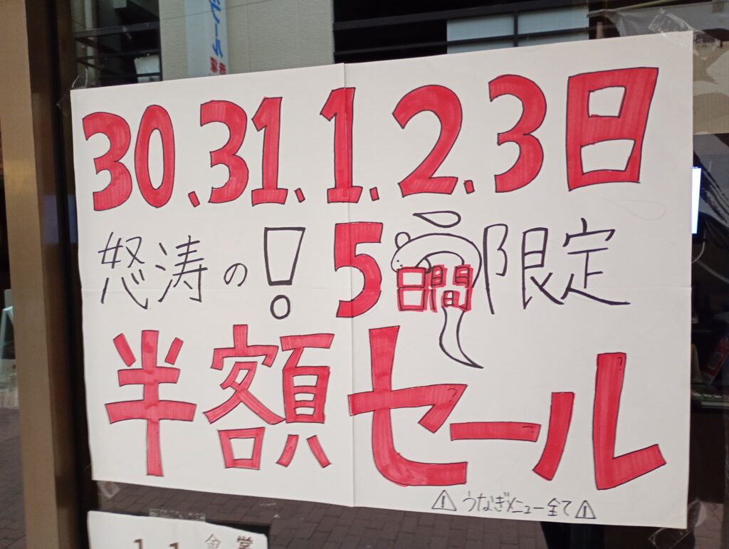 閉店に先駆けてうな重の半額セールを実施しています。下表の定価の半額で購入することができます。