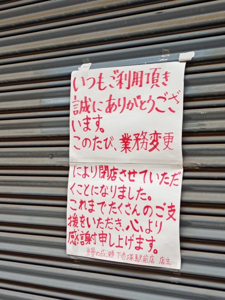 2025年11月1日をもって「鰻の成瀬 下赤塚店」が閉店となりました。閉店前はうな重が半額となるセールを実施していました。