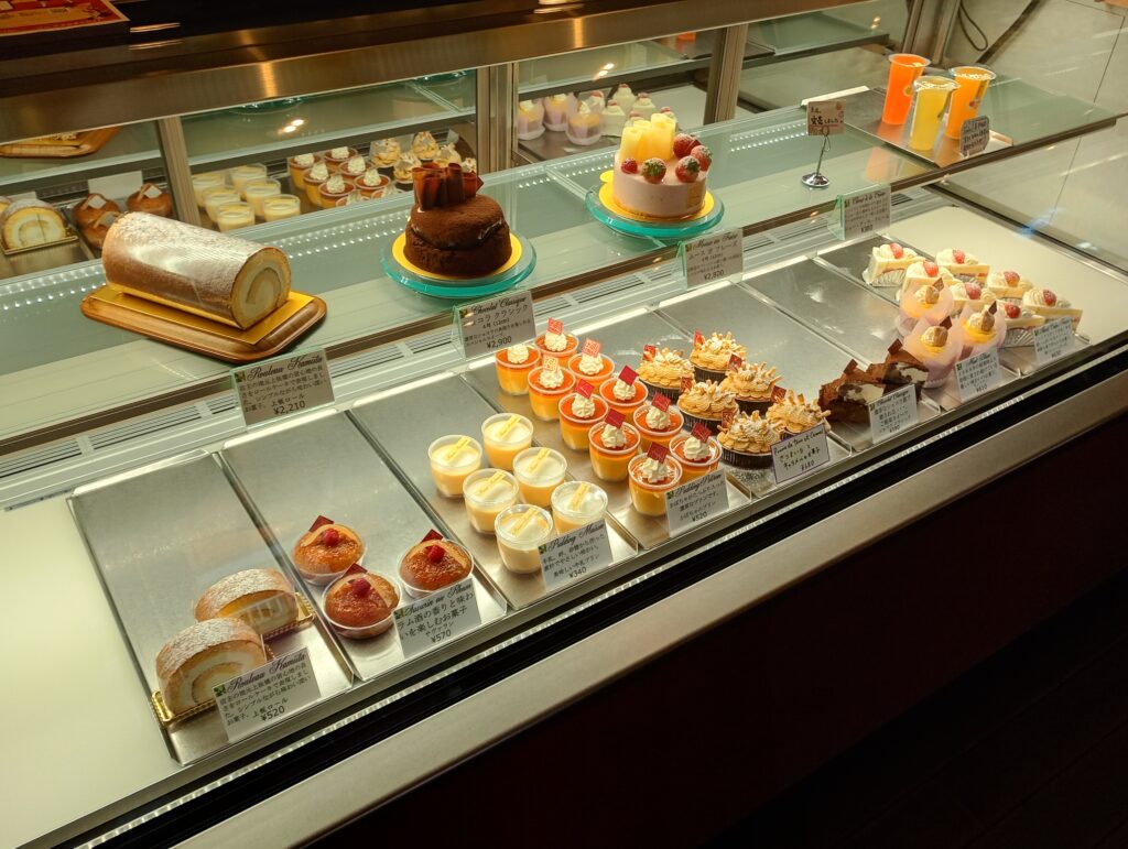 ショーケースには色とりどりのケーキが並んでいます。