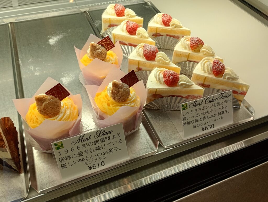 店員さんにお伺いしたところ1966年の創業当時から伝統の味を守る「モンブラン」610円や「苺のショートケーキ」630円人気だそうです。