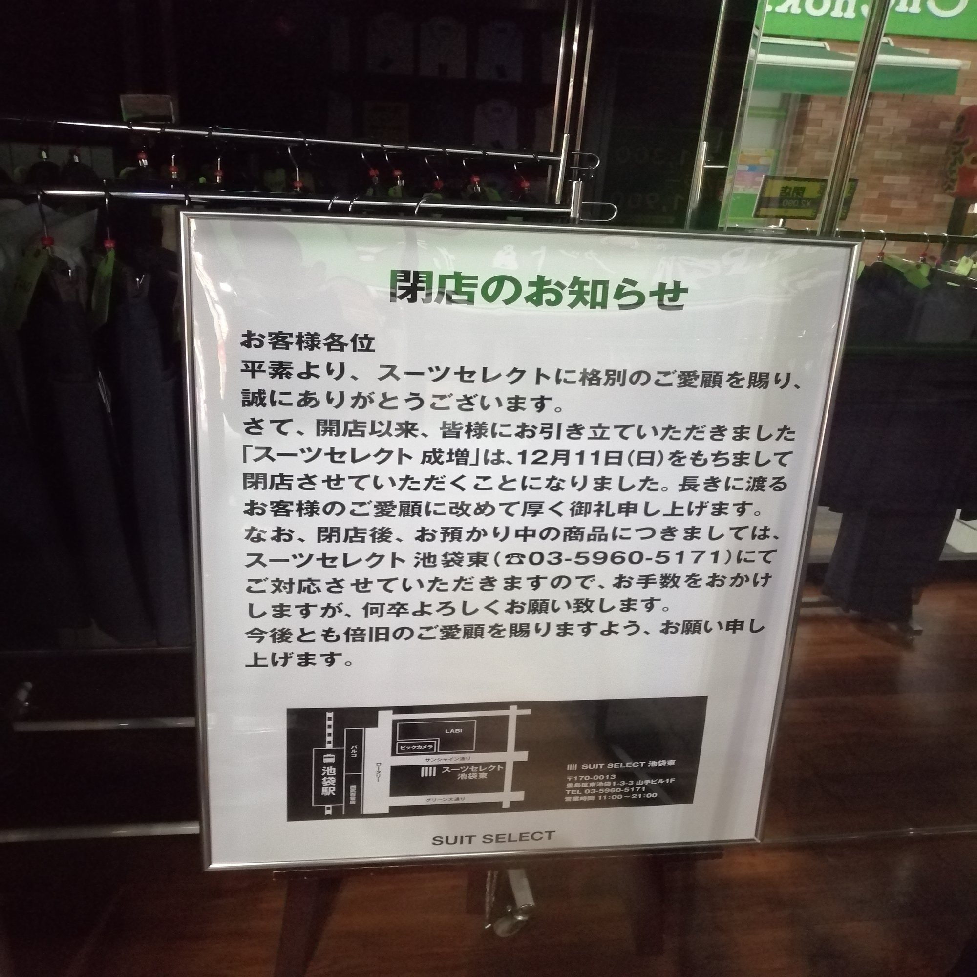 12月11日に閉店しました。閉店前は閉店セールを大規模に開催していました。最近はコロナ禍の影響もありスーツの販売も落ちていますのでなかなか収支が厳しかったそうです。