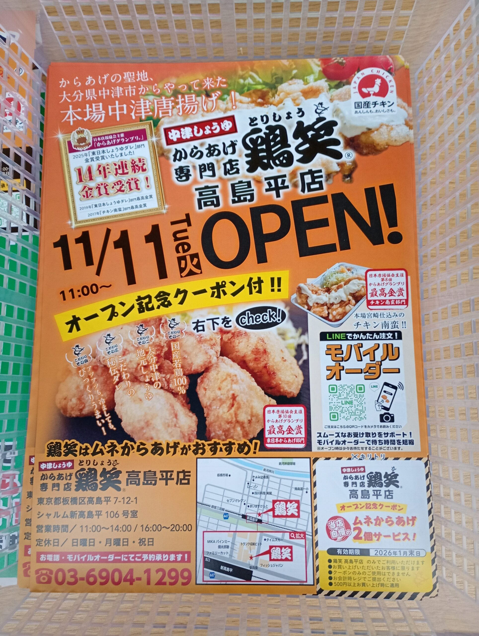 2025年11月11日に都営三田線新高島平駅の高島通りと反対側の住宅街に中津からあげ「鶏笑 高島平店」がオープンしたので、早速買いに行ってみました。