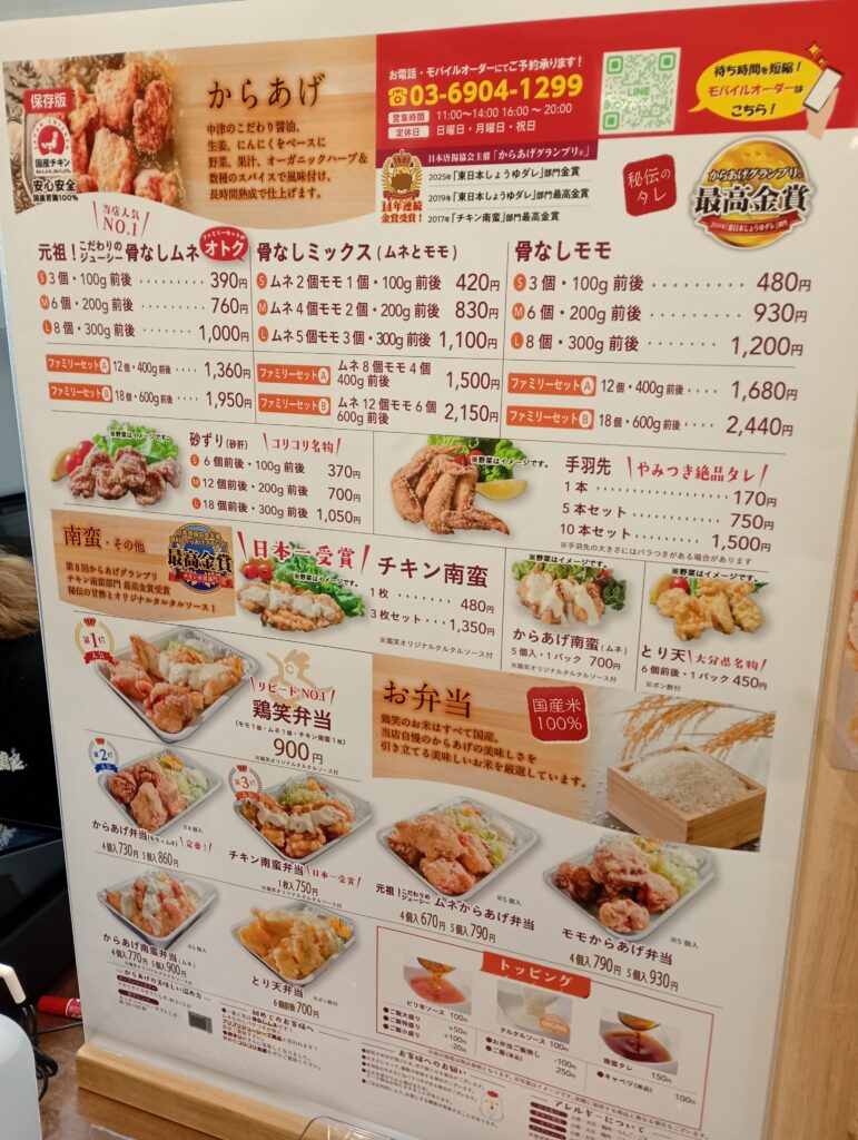 定番の「骨なしミックス(ムネ・モモ)」をはじめ、「チキン南蛮弁当」「とり天弁当」「手羽先」など様々なメニューを提供しています。特に国産のムネ肉を使用したからあげは、秘伝のタレに漬け込まれており、ふっくら柔らかいと人気です。