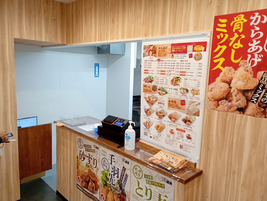 店内は注文や会計をするカウンターと椅子が三脚用意されていました。注文してから唐揚げを揚げ始めるので、お客さまへの配慮として椅子が用意されているそうです(LINEなどで事前に注文するのもいいかも知れません)。