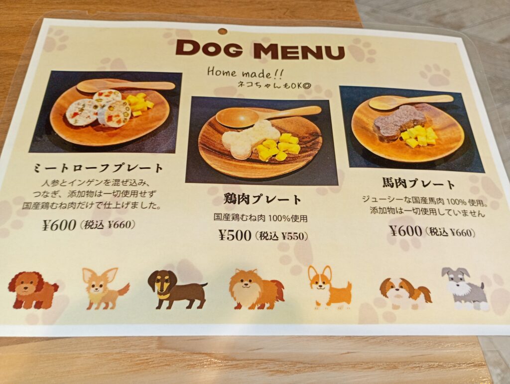犬や猫、ウサギなどのペットと同伴できるみたいです。ペット用のメニューもあったりします。