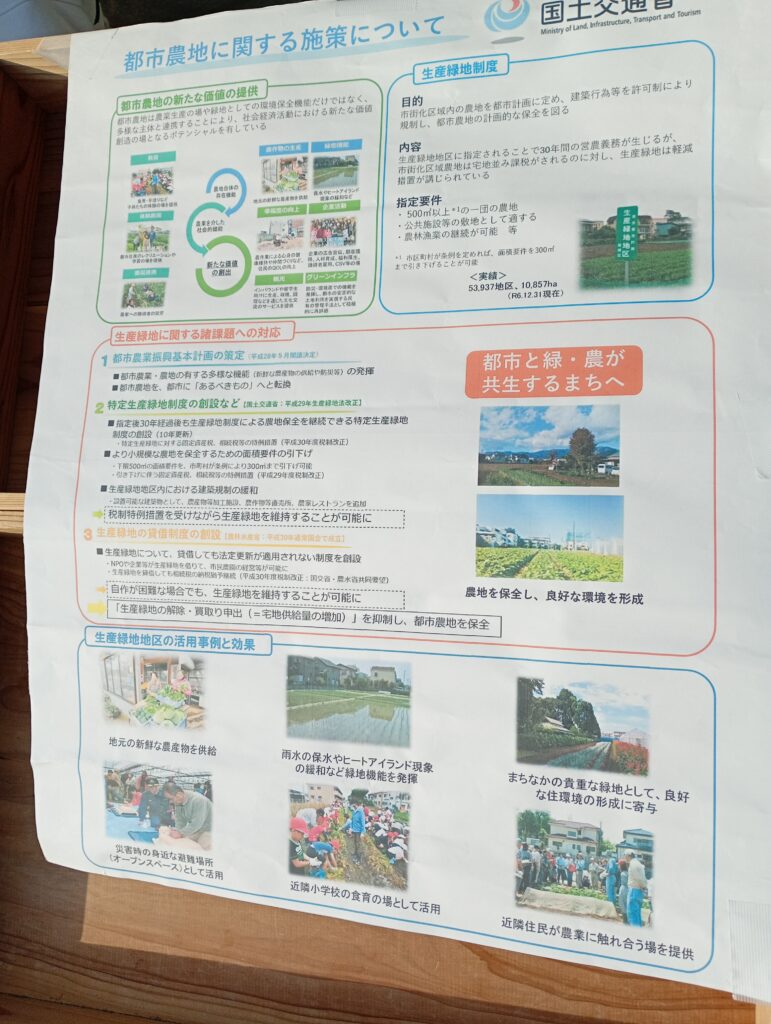 国土交通省の方がいたので都市農地について色々と聞いてみました。生産緑地制度があり、30年間の営農義務と引き換えに都市計画地において税制優遇が受けられるそうです。ただ、30年間の間には様々なライフイベントもあり、途中で営農義務を履行するのが難しかしくなることもあったりするのが実情だったりして、制度としての難しさも抱えているとか。