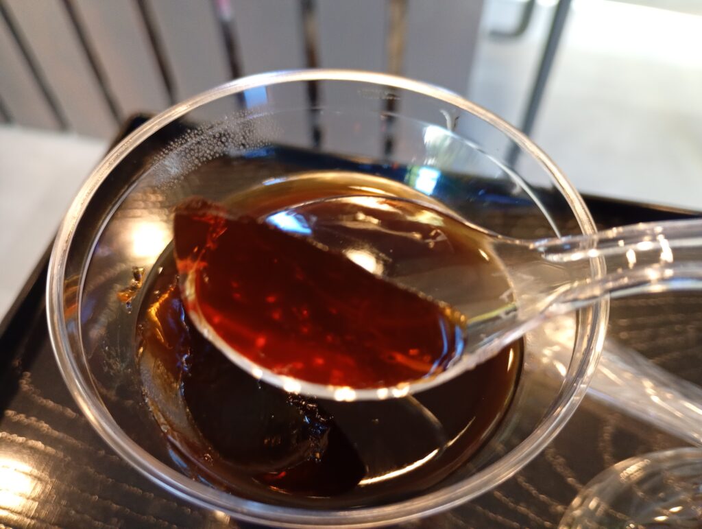 こちらはモカのコーヒーゼリー350円です。コーヒーの香りやビターな味わいがしっかりをプルプルの寒天の中に閉じ込めています。