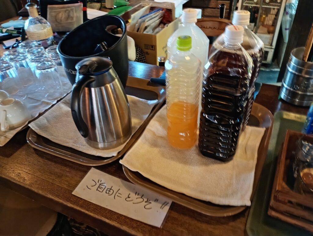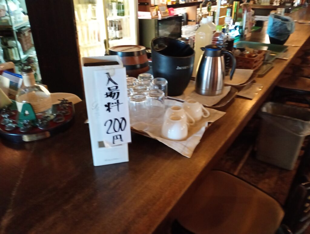 自動販売機が売り切れだったので、どうしようかと思ってお店の入り口を見てみると、気になる掲示が。どうやら、お昼の時間帯(11時半~14時)にお店を解放しているみたいですね。店内を覗いてみると「入場料200円」でフリースペースとして利用できるとのことです。