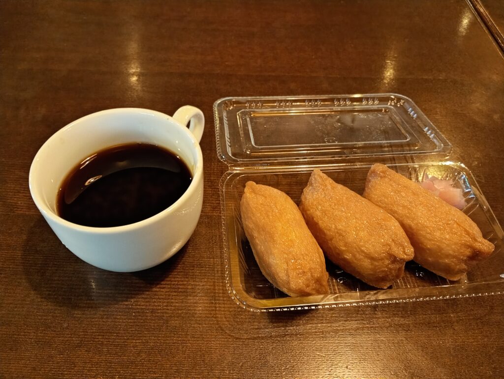 A-oneさんの目と鼻の先にある「三好さん」でお稲荷さんを購入して、A-oneさんでコーヒーを頂きながらお昼休憩です。