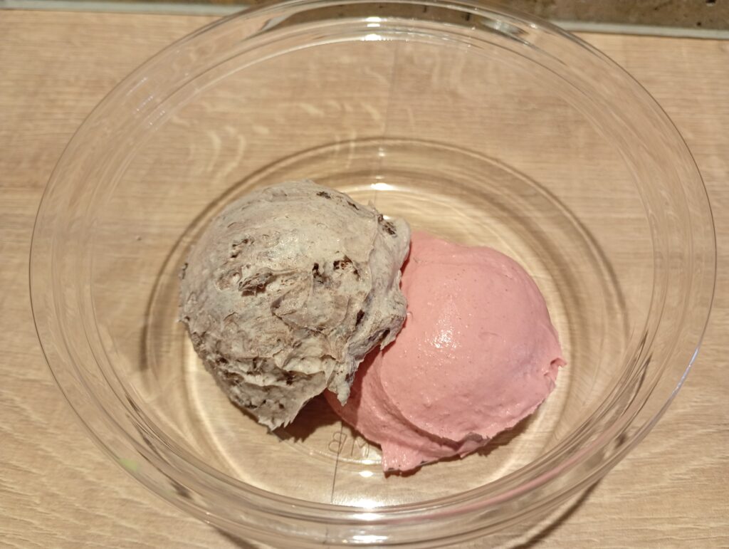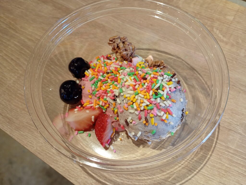 店長のおすすめのストロベリーとオレオを注文してみました。フレーバーが入るとグリークヨーグルトのモッタリ感が少し滑らかになり、食感も変わるそうです。