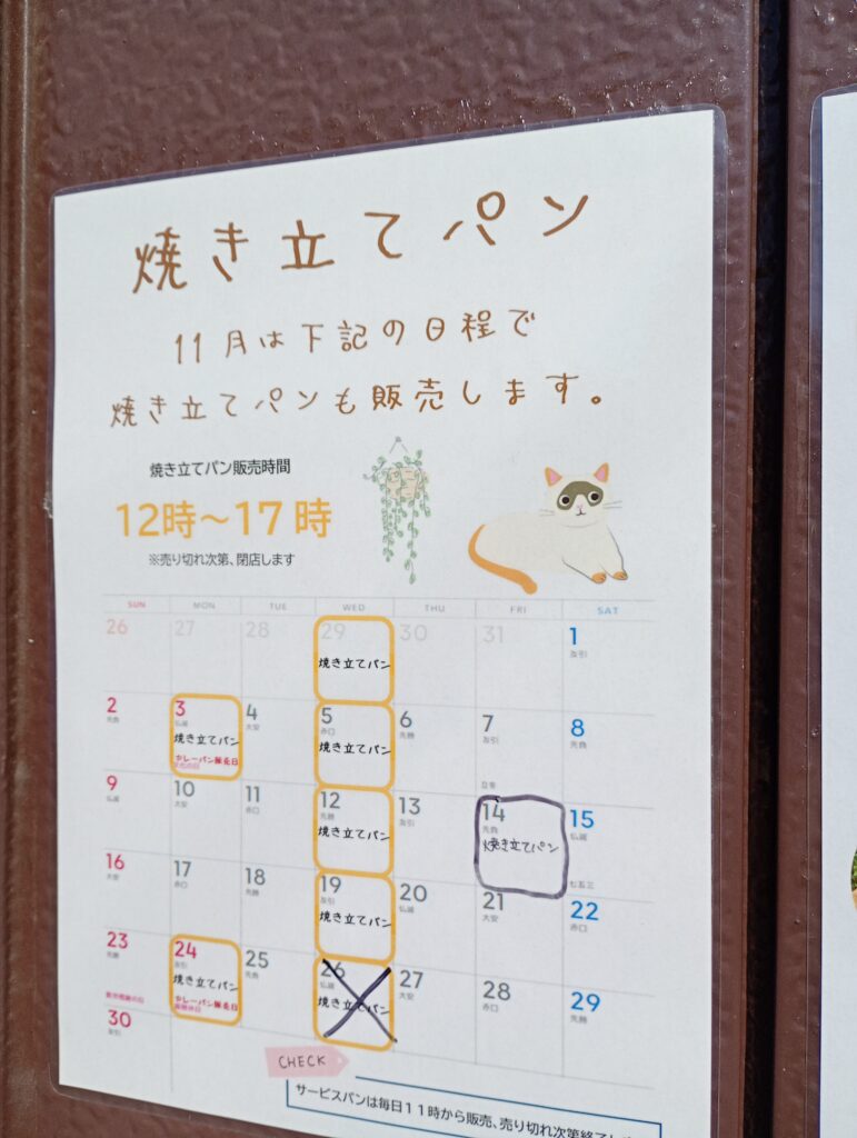 | 営業時間 | 11:00~14:00(売り切れ次第終了) ※焼き立てパンの日は17時営業終了。 |